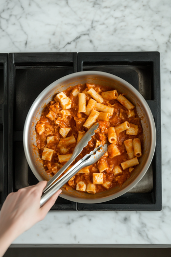 Combine: Add the cooked rigatoni to the sauce, stirring to coat the pasta evenly. Let everything simmer together for another 2-3 minutes.
