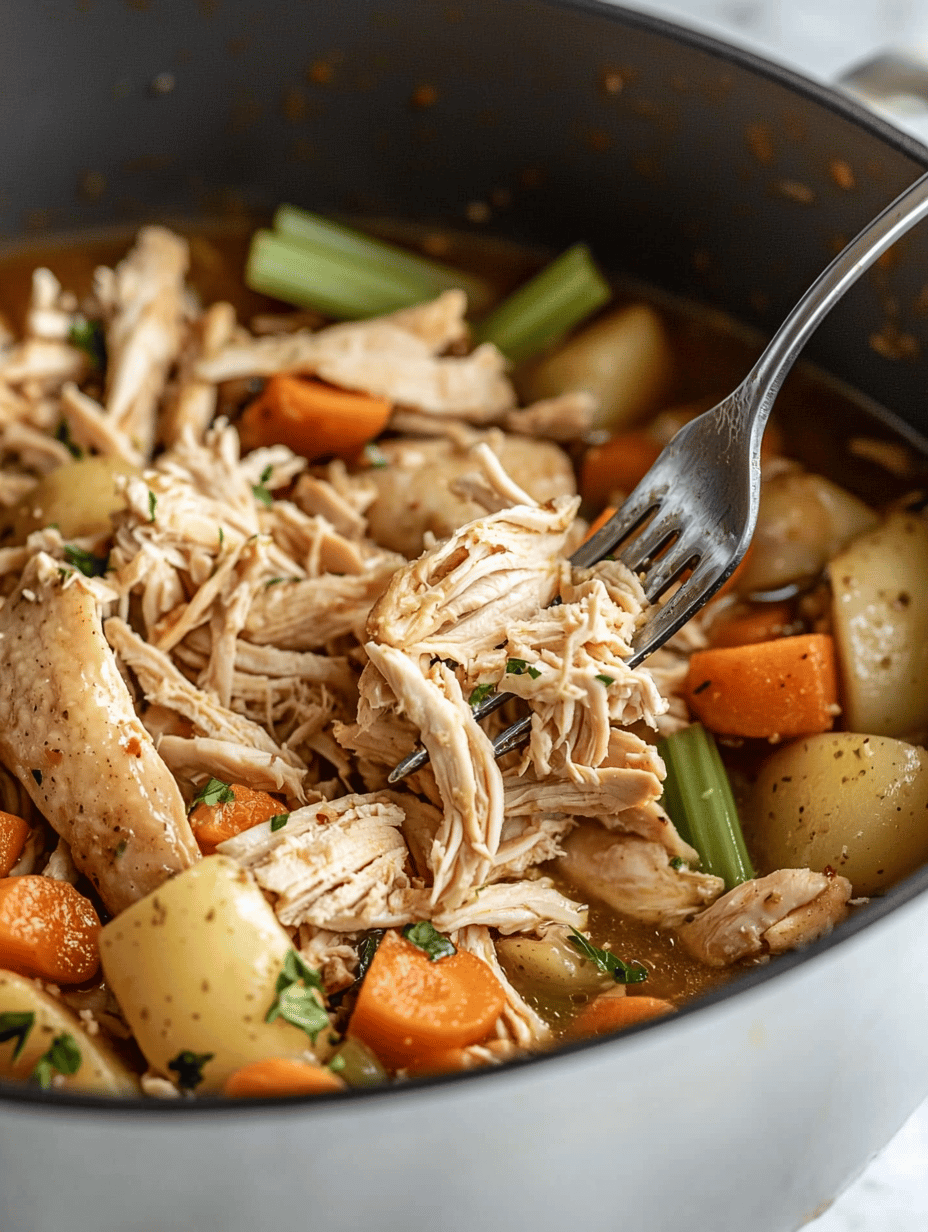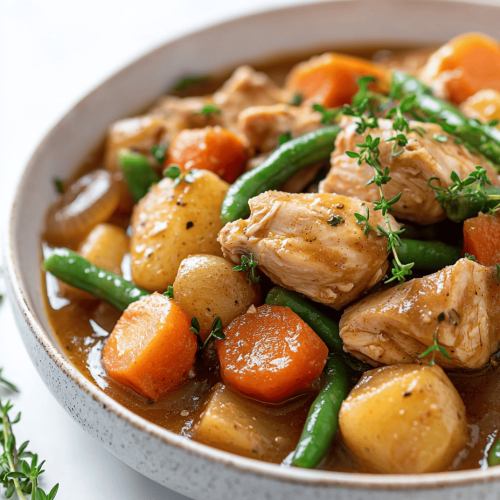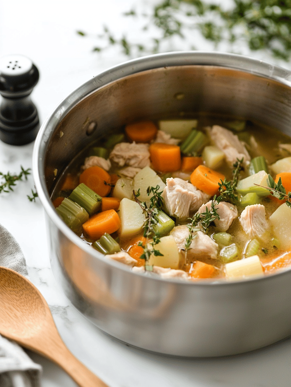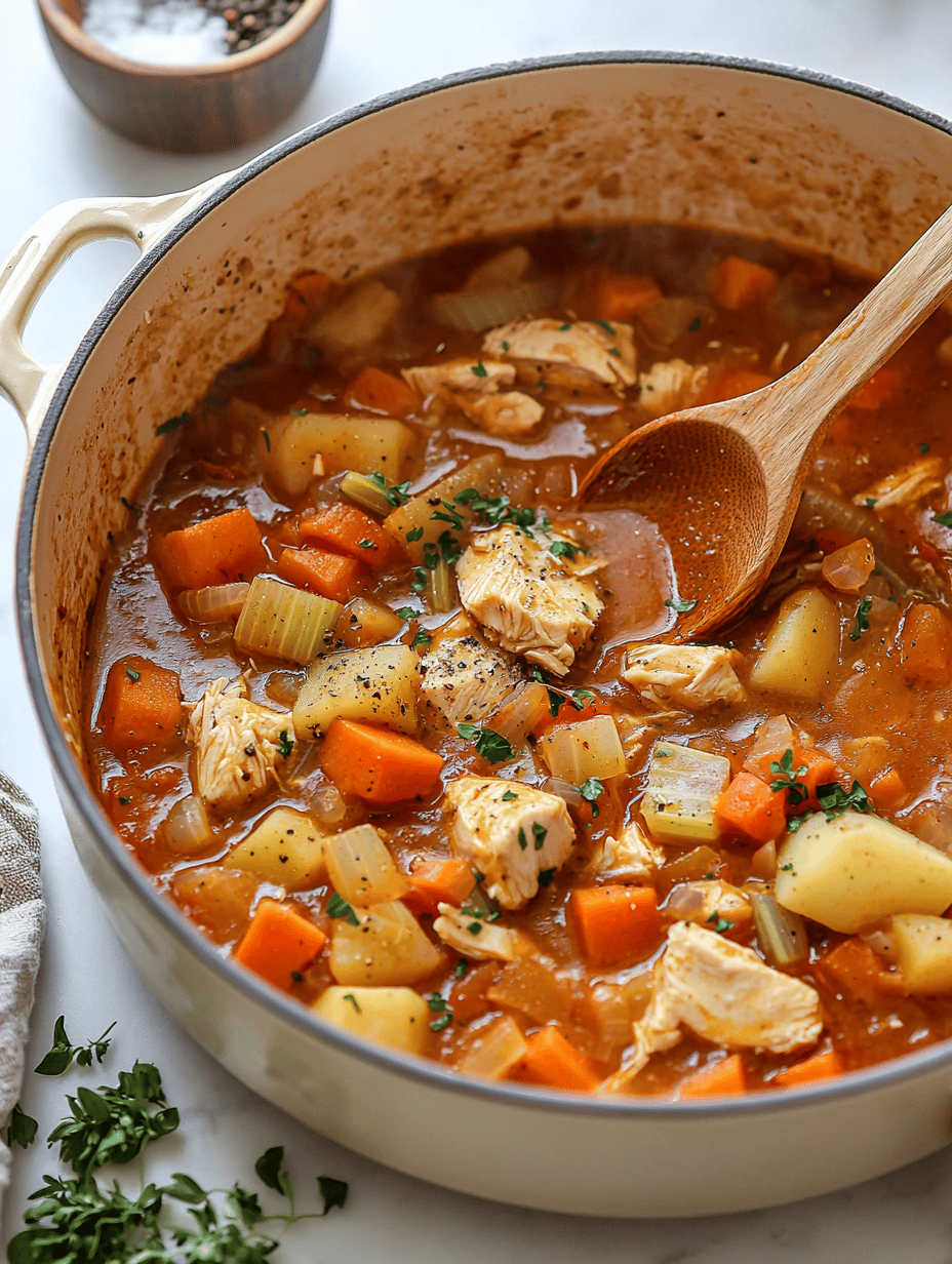This hearty stew combines tender chicken, roasted root vegetables, and aromatic herbs simmered in a savory broth. The dish features a thick, comforting texture with colorful vegetables and shredded chicken, creating a warming, rustic meal perfect for fall evenings.