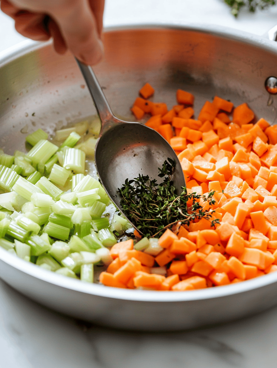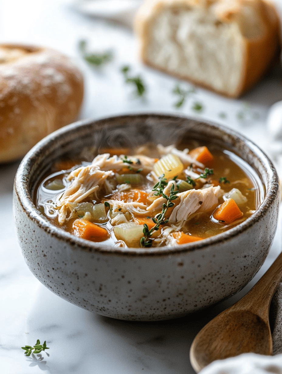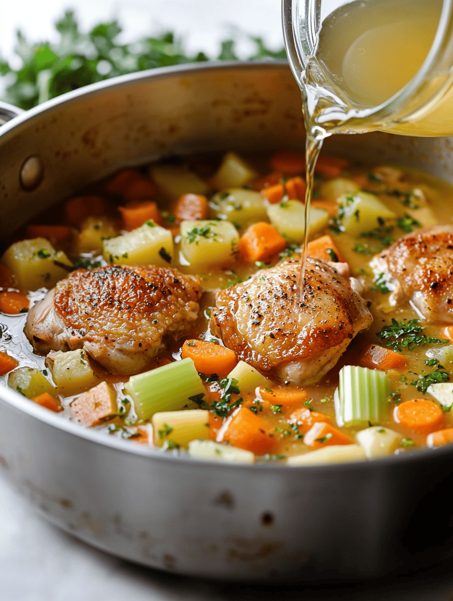 This hearty stew combines tender chicken, roasted root vegetables, and aromatic herbs simmered in a savory broth. The dish features a thick, comforting texture with colorful vegetables and shredded chicken, creating a warming, rustic meal perfect for fall evenings.