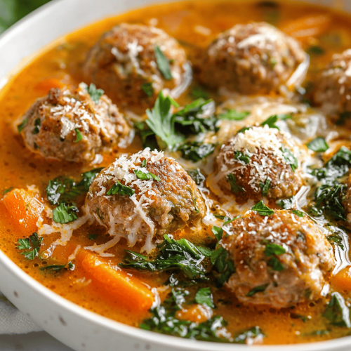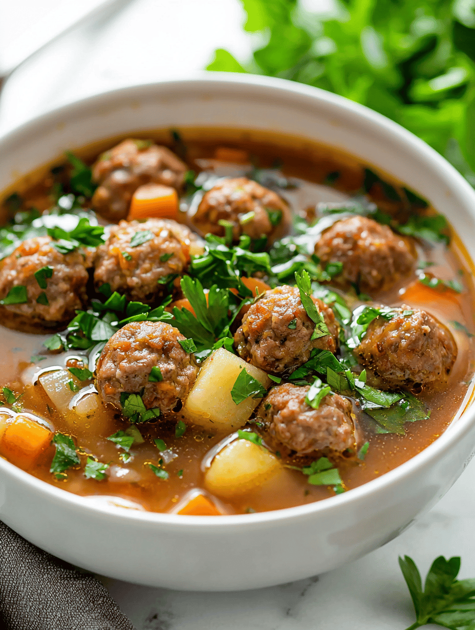 This hearty soup combines tender meatballs simmered in a flavorful broth infused with fall herbs. It has a thick, velvety texture with chunks of vegetables and juicy meatballs that create a comforting, rustic appearance. The slow-cooking method ensures all flavors meld into a rich, savory dish perfect for cozy evenings.