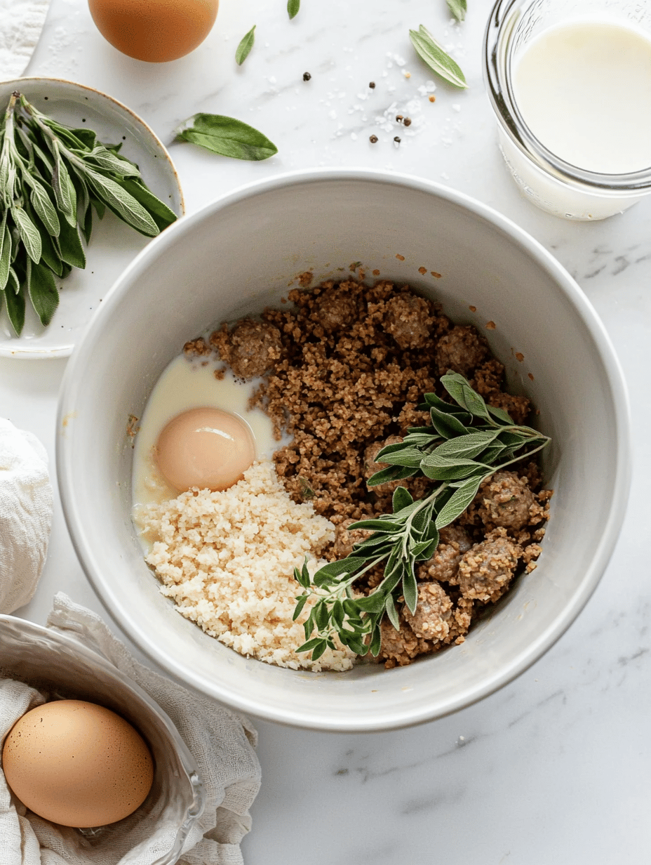 Combine ground beef, breadcrumbs, milk, egg, minced garlic, thyme, sage, and a pinch of salt and pepper in a large bowl. Mix gently until just combined, then form into small meatballs, about 1 inch in diameter.