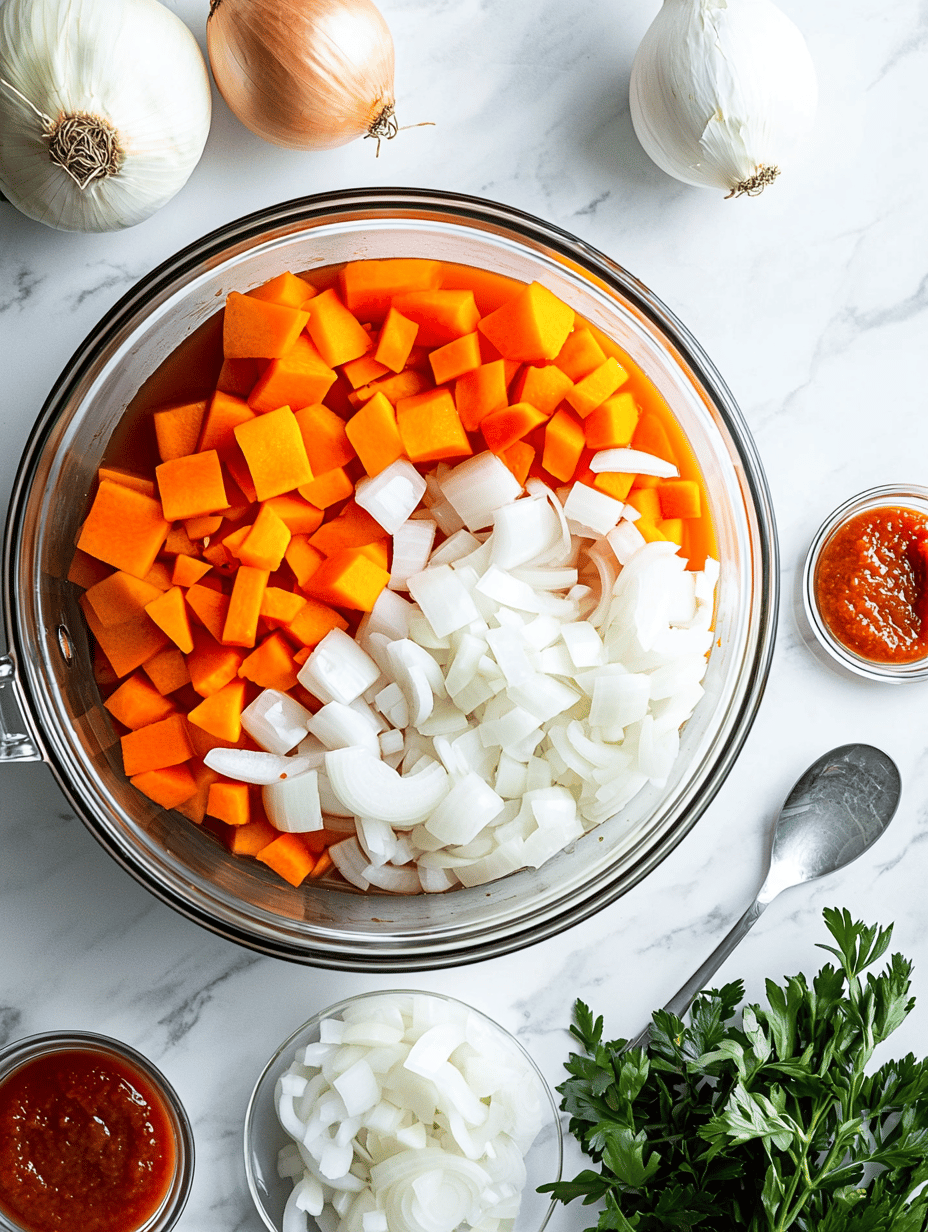 Add chopped onions, carrots, and diced squash to the slow cooker. Pour in the chicken broth and stir in tomato paste along with red pepper flakes if using. This creates a rich, seasonal base for the soup.