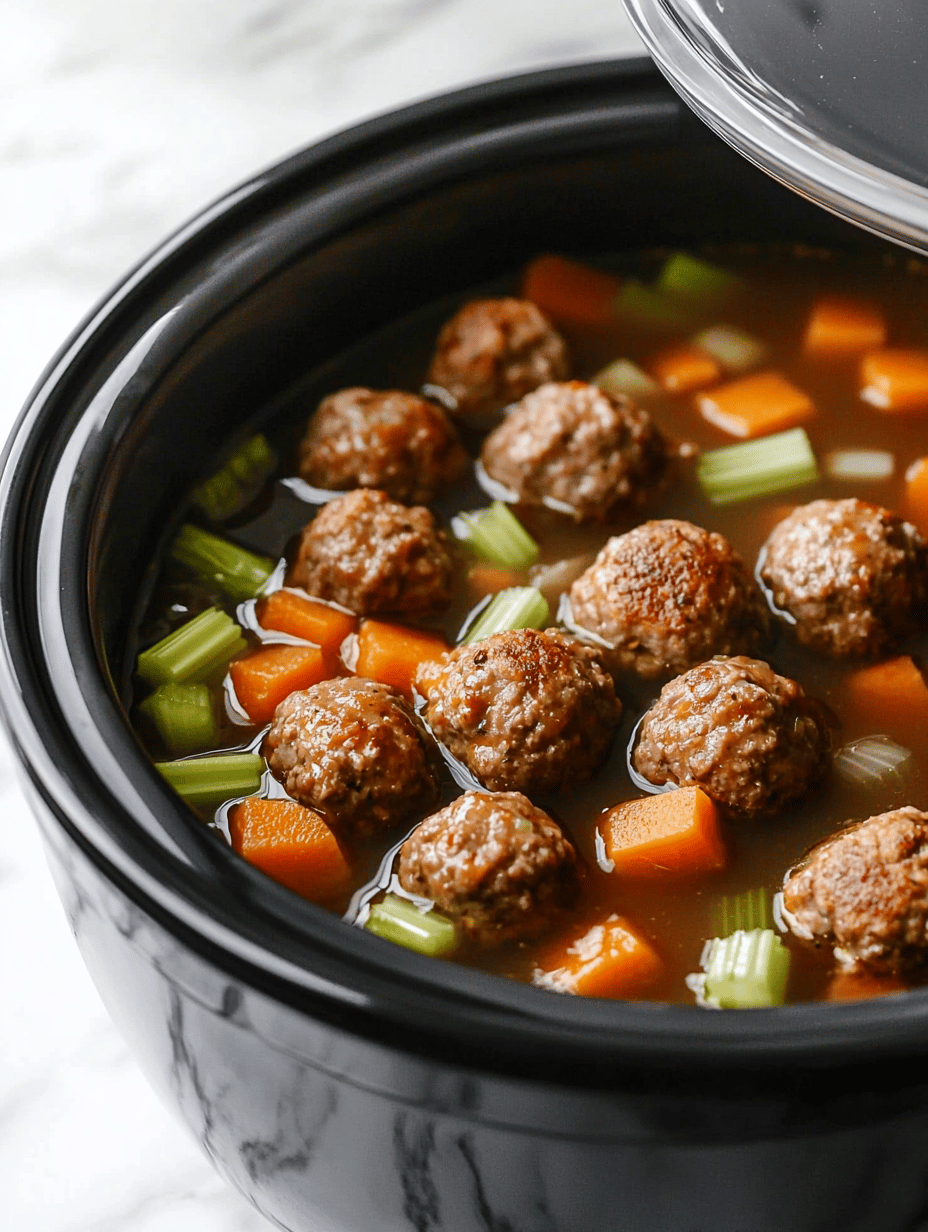 Gently place the browned meatballs into the slow cooker, making sure they are submerged in the broth and vegetables. Cover with the lid and set to cook on low for 4 hours, allowing flavors to meld and meatballs to become tender.