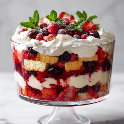 Repeat the layers—ladyfingers, custard, and berries—until the bowl is nearly full, finishing with a layer of berries on top.