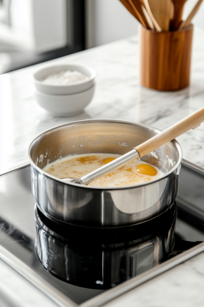 Once combined, pour the egg mixture into the saucepan and cook on medium-low heat, stirring until it thickens slightly (around 170°F or 76°C).
