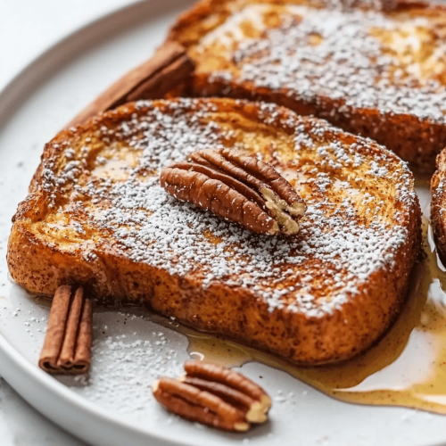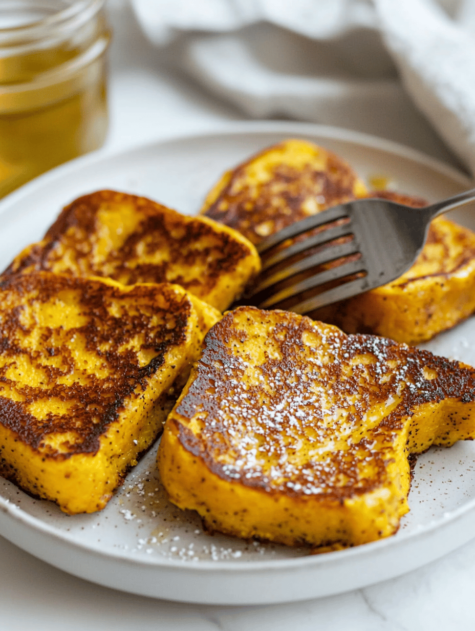 This pumpkin French toast is made by dipping slices of gluten-free bread into a flavorful batter composed of eggs, almond flour, coconut milk, and pumpkin puree, then pan-fried until golden brown. The final dish features a crispy exterior with a tender, custardy interior, infused with warm spices and roasted pumpkin aroma.