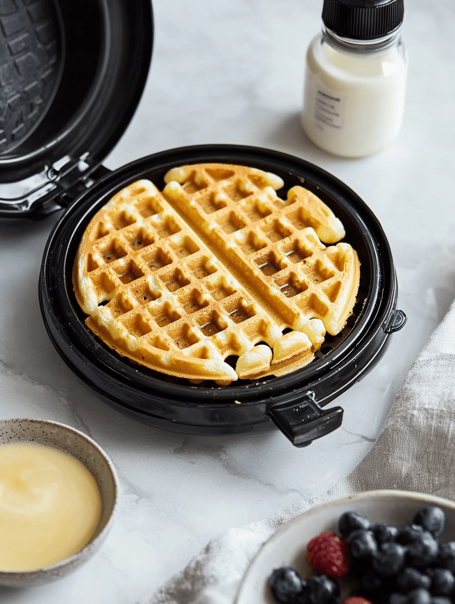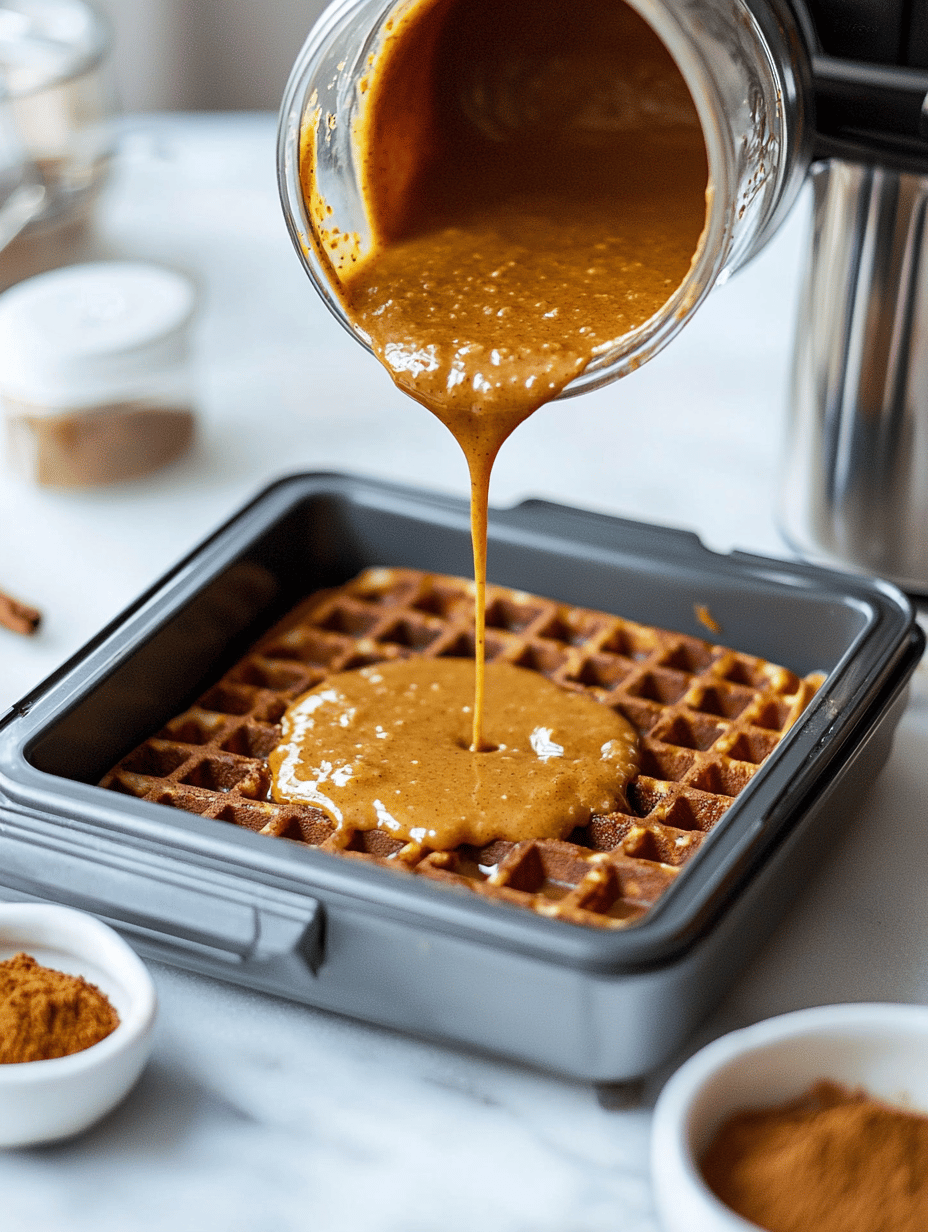 Pour an appropriate amount of batter into the center of the preheated waffle iron, close the lid, and cook until the waffle is golden brown and crispy around the edges, about 3-4 minutes.