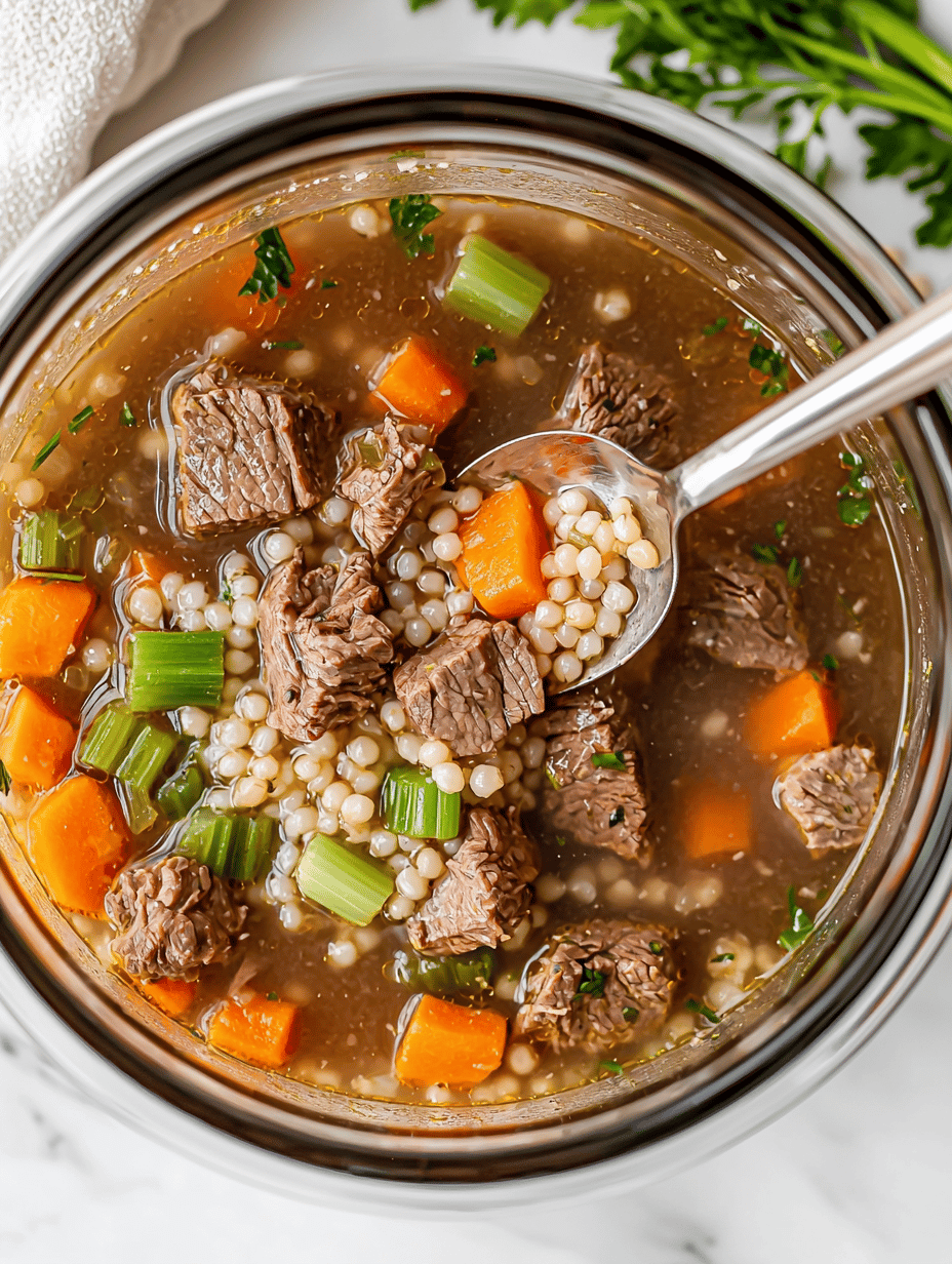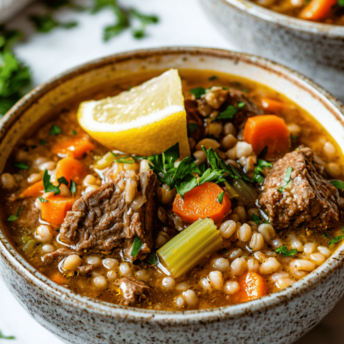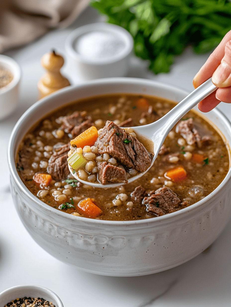 This beef and barley soup is made by slow-cooking tender chunks of beef with hearty barley, vegetables, and herbs. The dish develops a thick, comforting texture with a rich, savory broth and chewy barley, resulting in a rustic, chunky soup with a warm appearance.