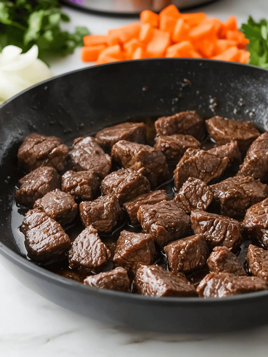 Heat a large skillet over medium-high heat and add olive oil. Sear the beef chunks until browned on all sides, about 5 minutes, then transfer to your slow cooker.