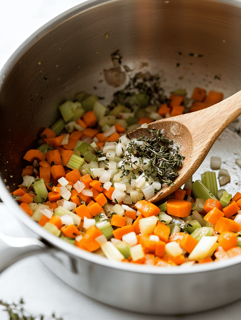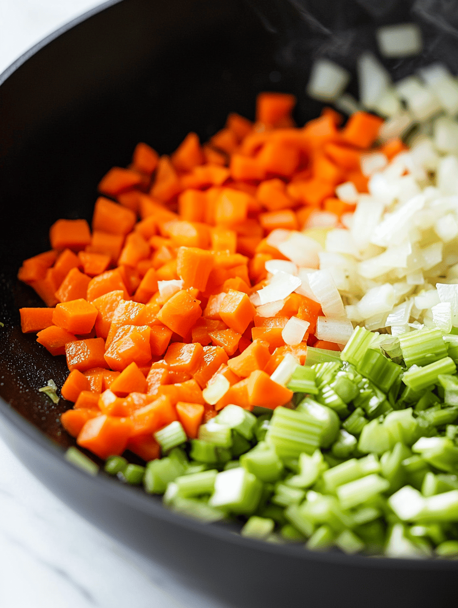 In the same skillet, add diced onions, carrots, and celery. Cook until they soften slightly and release their aroma, about 4 minutes, stirring occasionally.