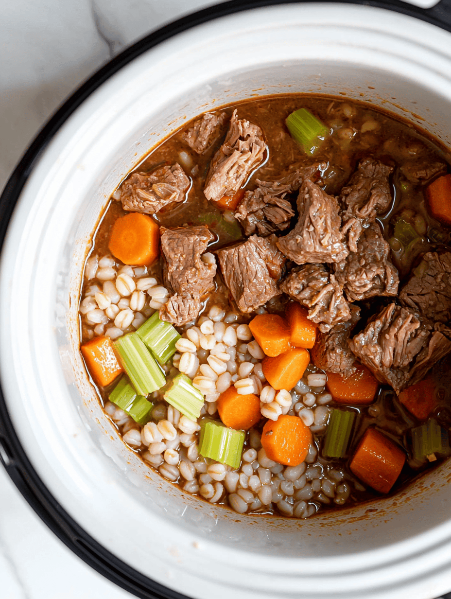 Cover the slow cooker with the lid, set to low, and cook for 7 to 8 hours until the beef is tender and the barley is chewy and plump, and the soup has thickened slightly.