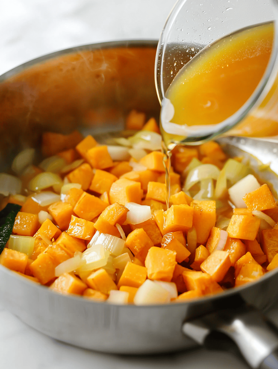 Pour in the vegetable broth and bring the mixture to a gentle simmer. Cook uncovered for about 10 minutes to let the flavors meld and the squash soften further.