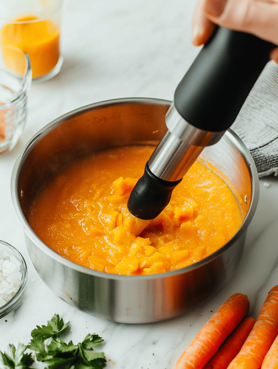 Use an immersion blender to blend the soup directly in the pot until smooth and velvety. Alternatively, carefully transfer the soup in batches to a blender, then return it to the pot.