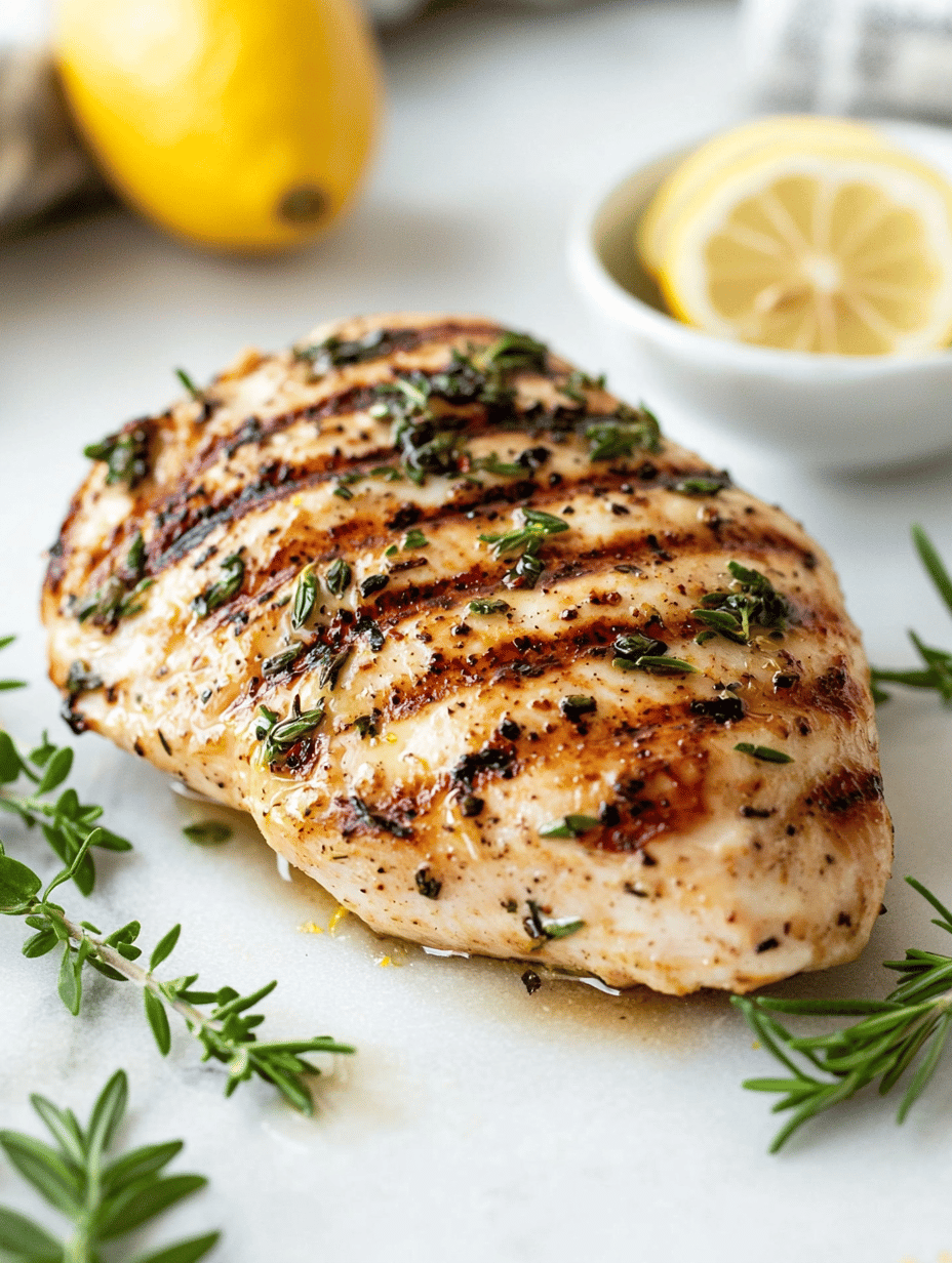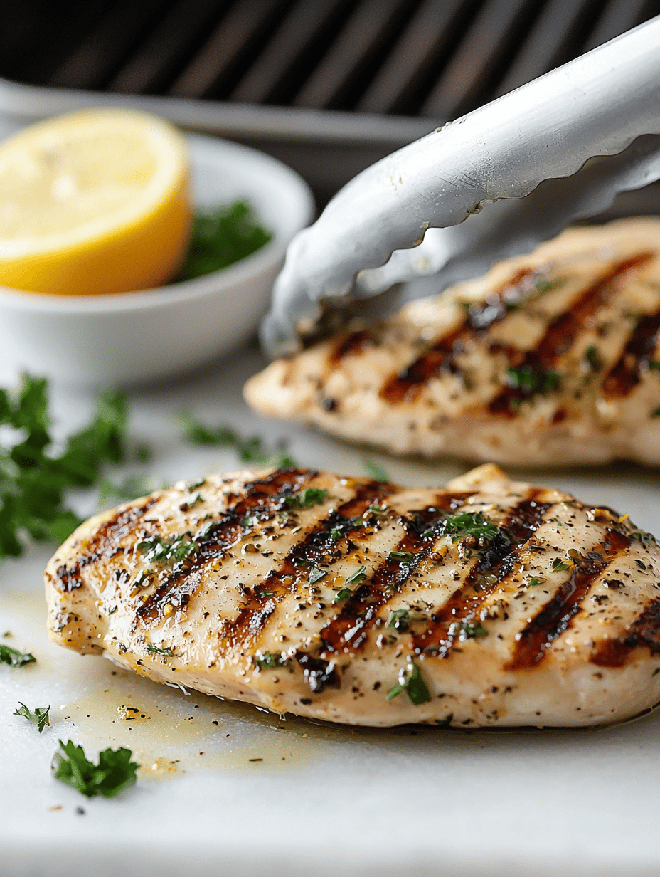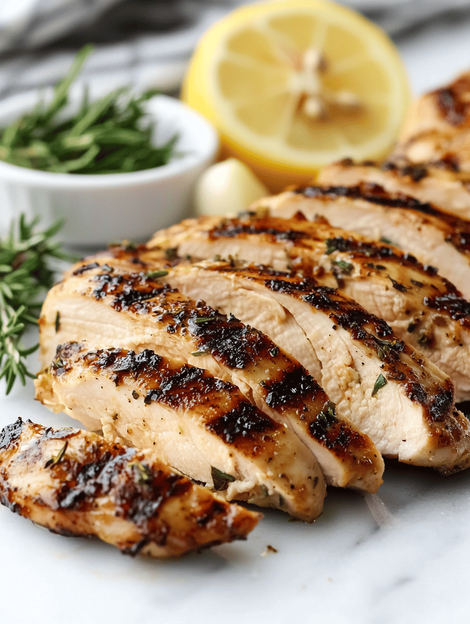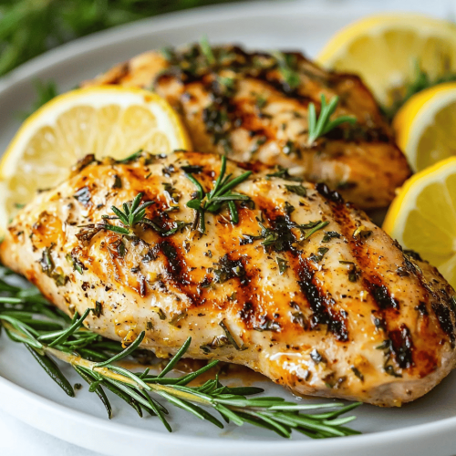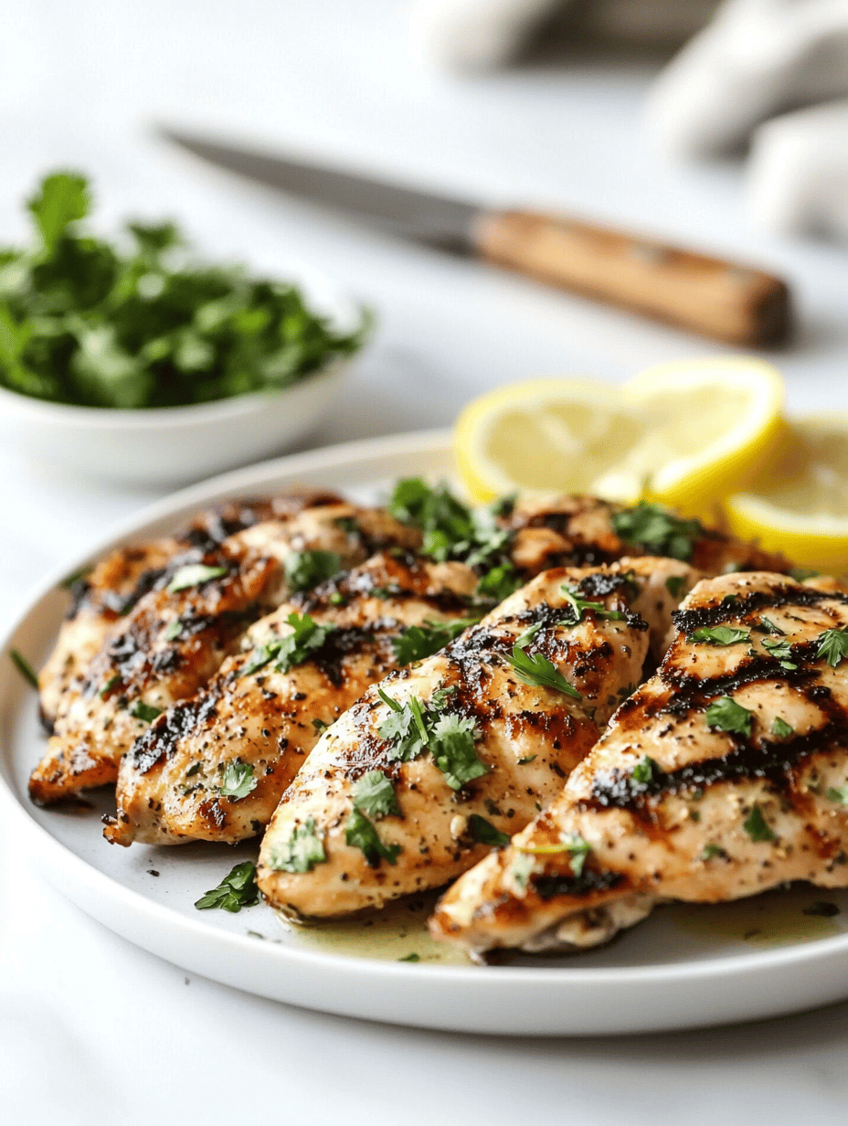 This dish features chicken breasts marinated in a bright, herbaceous citrus blend, then grilled to develop crispy edges and caramelization. The high heat creates a juicy interior with a smoky, flavorful crust, resulting in tender, flavorful chicken with a vibrant appearance.