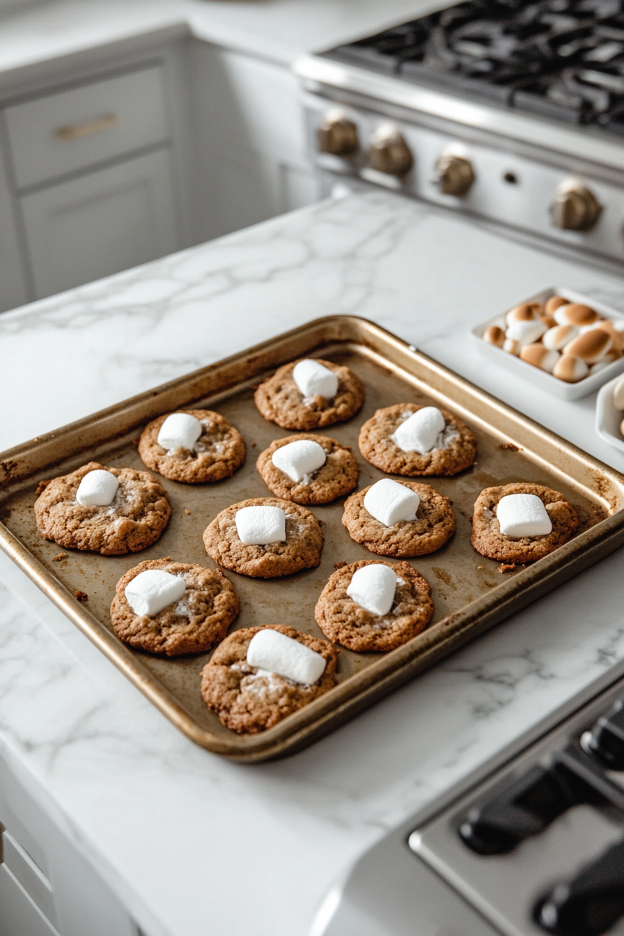 Bake one sheet at a time for 9 minutes, remove from oven, and place marshmallows (1 large halved or 3 mini) on top of each cookie.