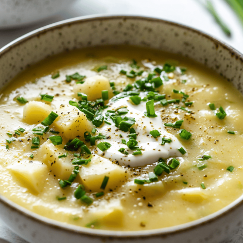 This Irish potato and leek soup is made by gently simmering sliced potatoes and leeks in broth until tender, then blending until smooth for a velvety texture. Finished with butter and thyme, it presents a creamy, pale-green bowl with a comforting aroma and a subtly thick consistency.