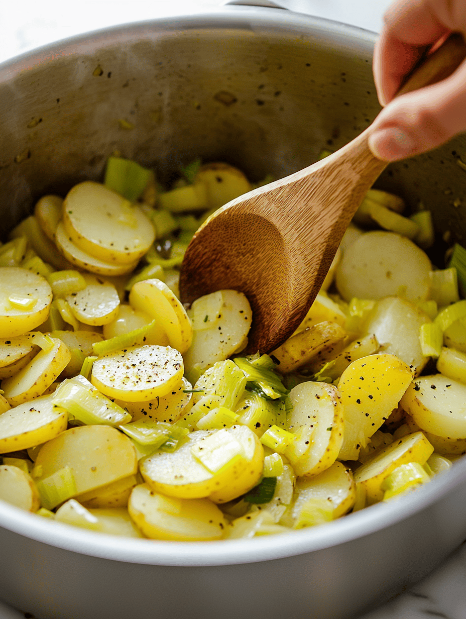 Stir in the sliced potatoes and cook for another 2 minutes, allowing the flavors to meld and the potatoes to start softening.