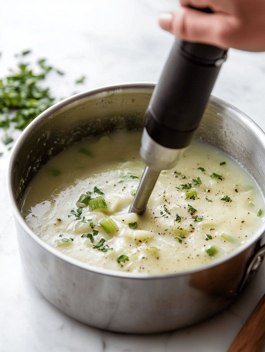 Remove the pot from heat and use an immersion blender to carefully blend the soup until smooth and creamy. Alternatively, transfer batches to a blender and puree, then return to the pot.