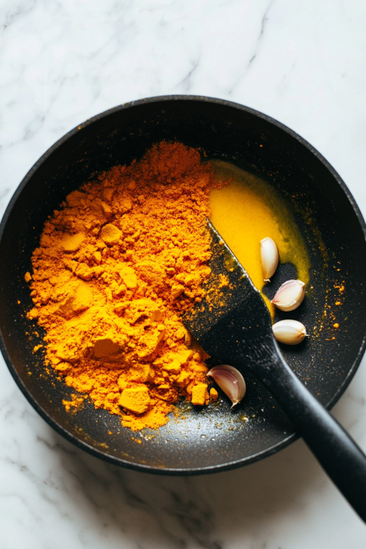 Add turmeric, curry, garlic, salt, and black pepper. Stir well.