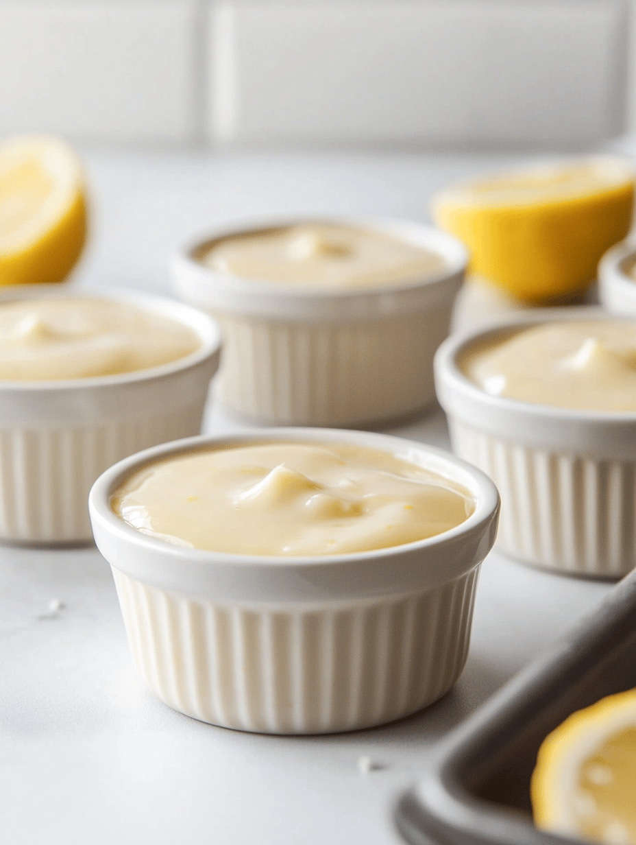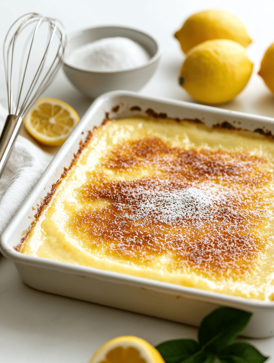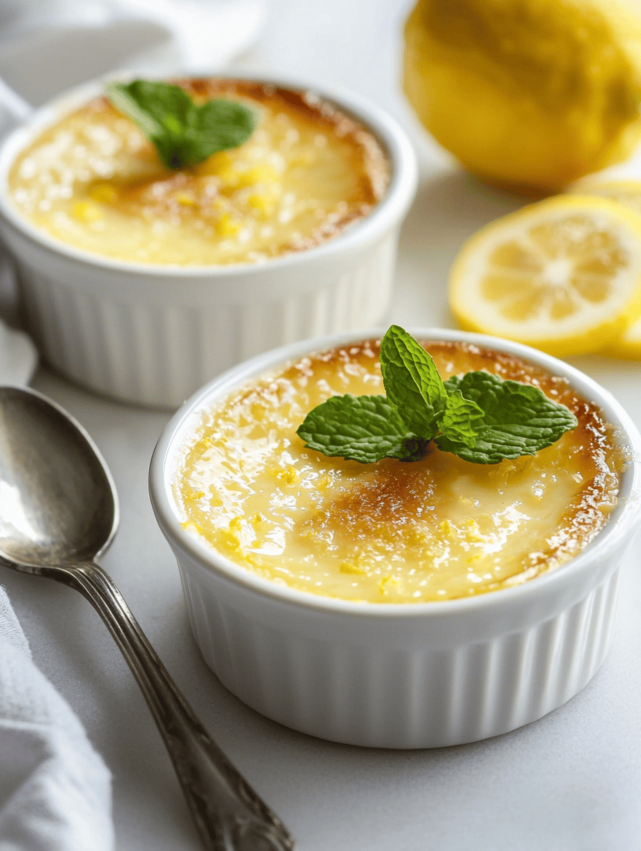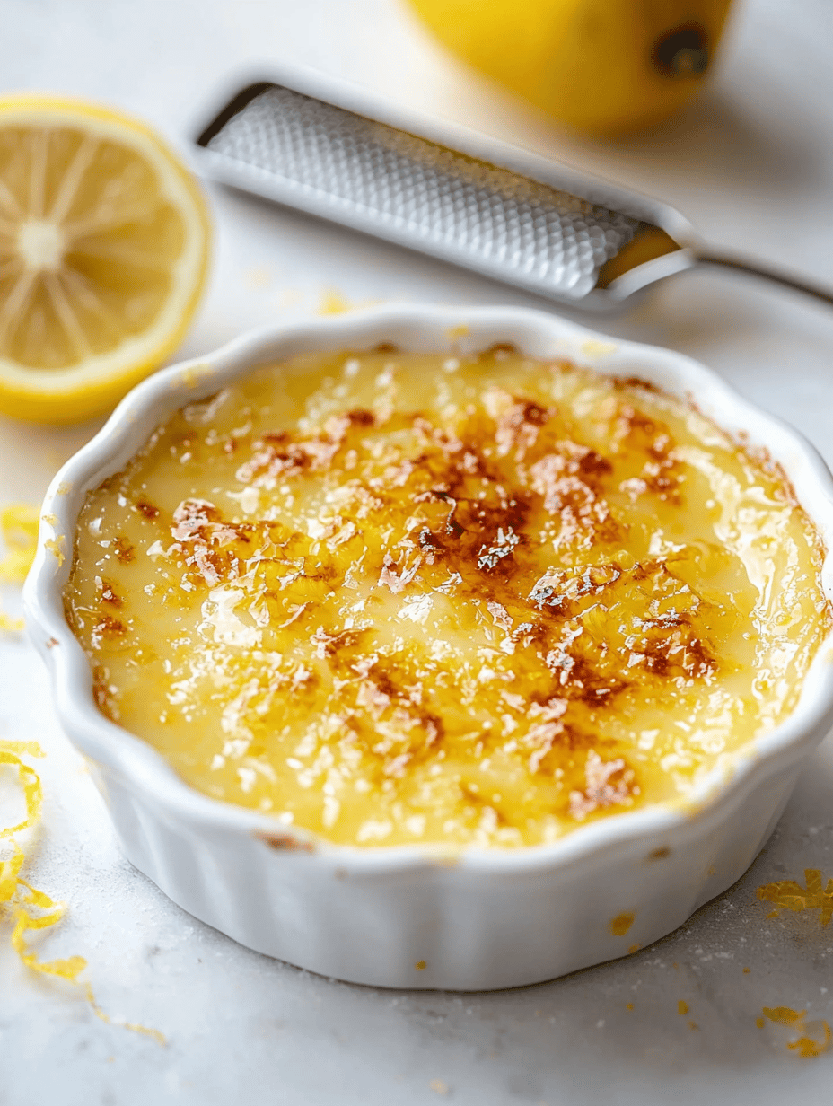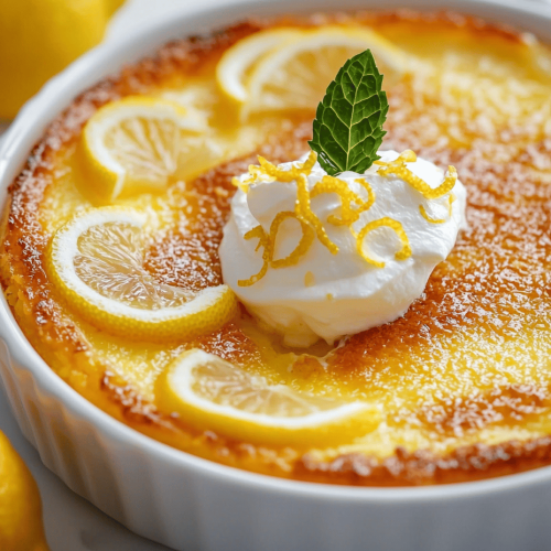 This lemon baked pudding is a silky, custard-like dessert with a bright citrus flavor. It is made by gently baking a lemon custard until set with a delicate crackled top, resulting in a smooth and creamy final texture. The dish showcases a vibrant yellow color and a tender, slightly jiggly consistency with a hint of tanginess.