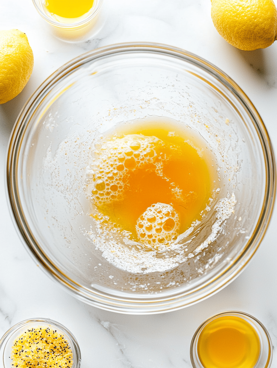 In a separate bowl, whisk the egg lightly, then add the vegetable oil, lemon juice, vanilla extract, and lemon zest. Mix until the mixture is smooth and fragrant with a bright citrus aroma.