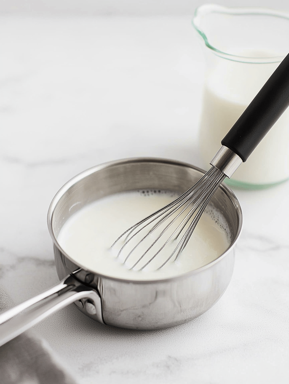 Pour the milk into a small saucepan and heat over medium heat until it begins to steam, just before boiling. Use a milk frother or whisk to create a velvety foam until the milk has doubled in volume and develops a smooth, creamy texture.