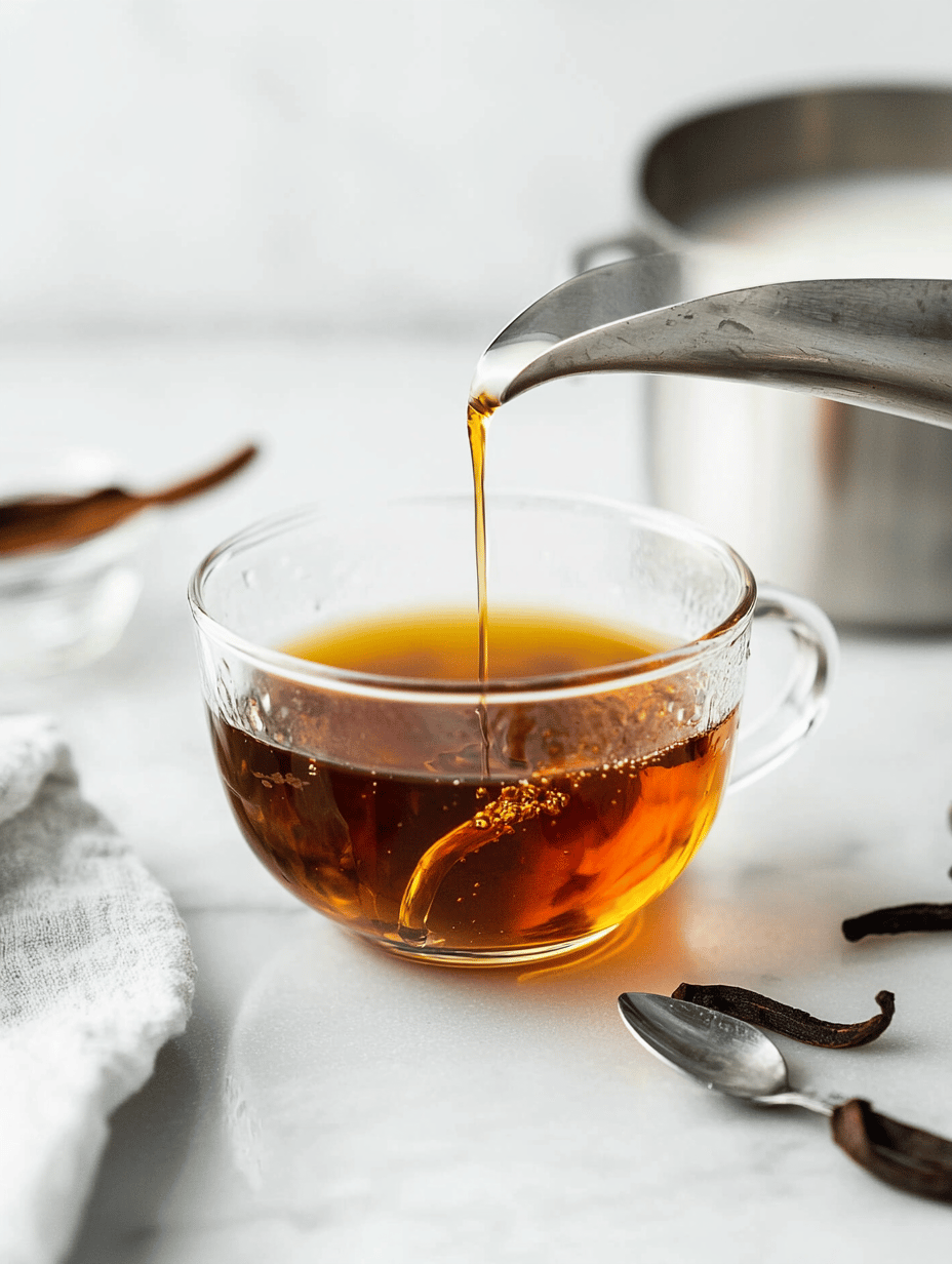 Add the vanilla syrup to the brewed tea and stir gently to combine, releasing a sweet, fragrant aroma. Pour the steamed milk into the tea, holding back the foam with a spoon.