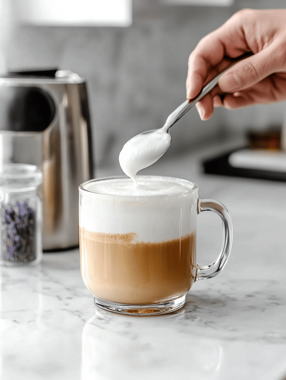 Finish by spooning or pouring the remaining milk foam onto the top for a fluffy cap and a visually appealing layered effect. Serve immediately in your favorite mug, enjoying the fragrant, creamy beverage.