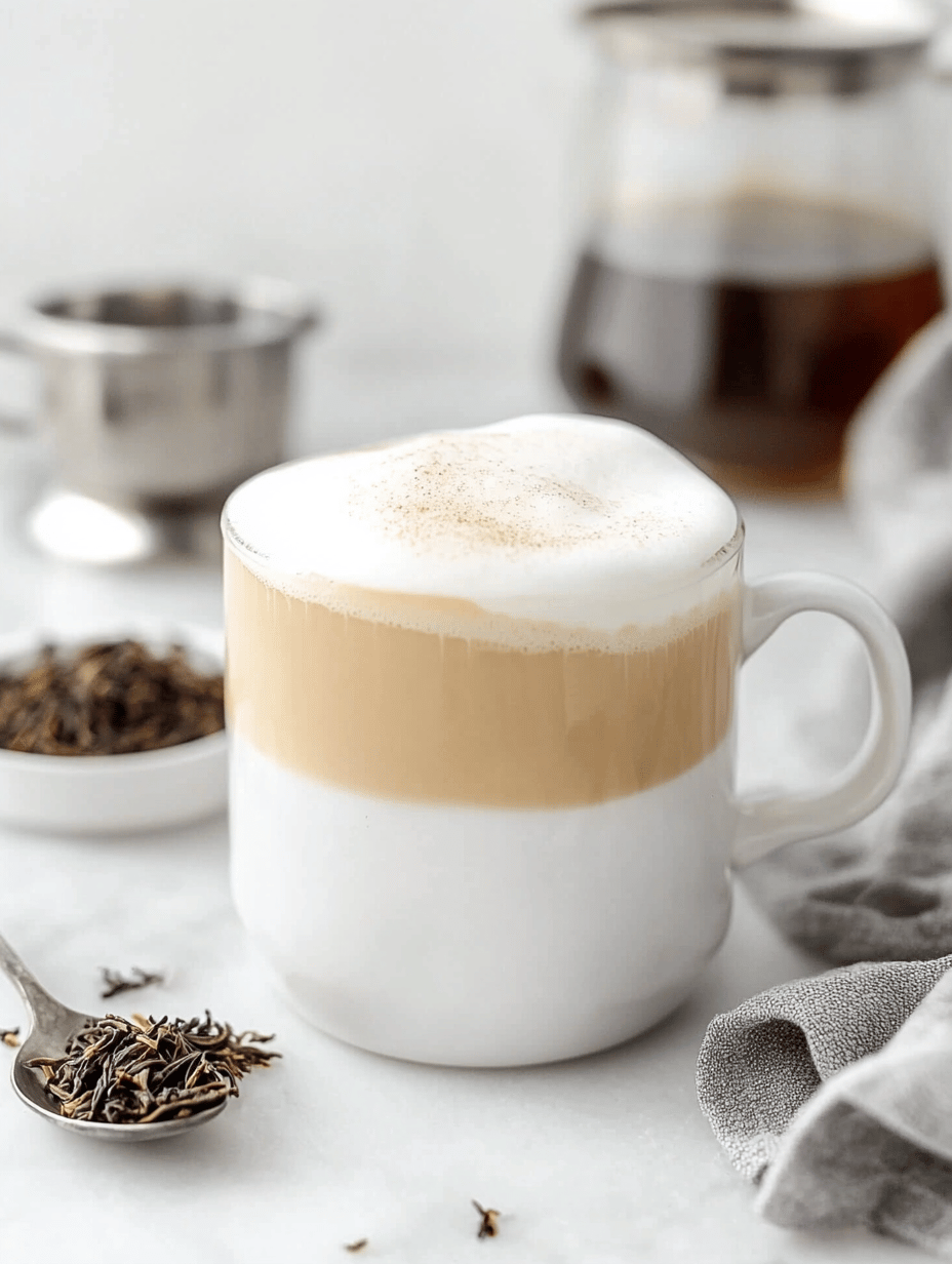 The London Fog Tea Latte is a warm beverage combining steeped Earl Grey tea with steamed milk and vanilla syrup. It features a silky, frothy texture with a fragrant vanilla aroma, finished with a smooth, creamy appearance that’s perfect for cozy moments.