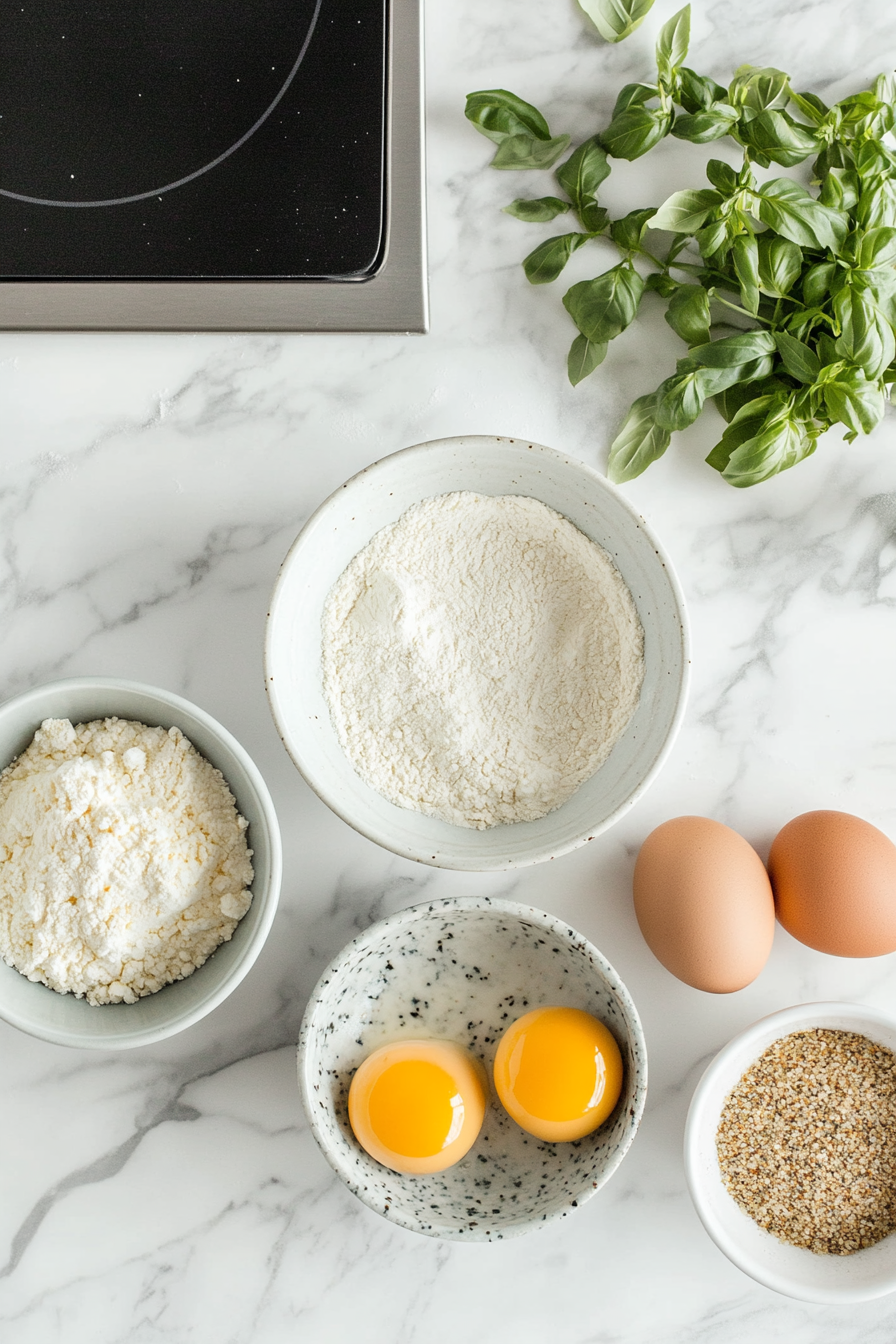 Set up a breading station with three separate shallow bowls. Place flour in the first bowl, beaten eggs in the second bowl, and breadcrumbs mixed with garlic powder, onion powder, dried oregano, dried basil, salt, and black pepper in the third bowl.