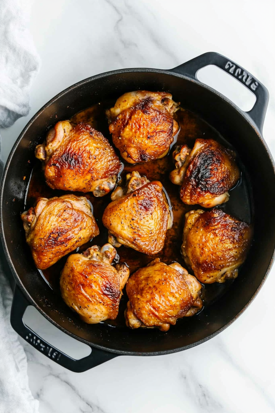 - Sear the chicken thighs (skin-side down) until golden brown, then flip.