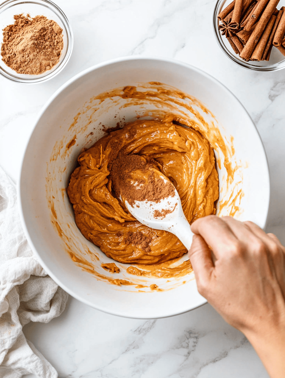 Add ground cinnamon, ginger, and nutmeg to the pumpkin mixture, and stir until fragrant and evenly distributed. This creates the warm spice flavor that defines the cheesecake.