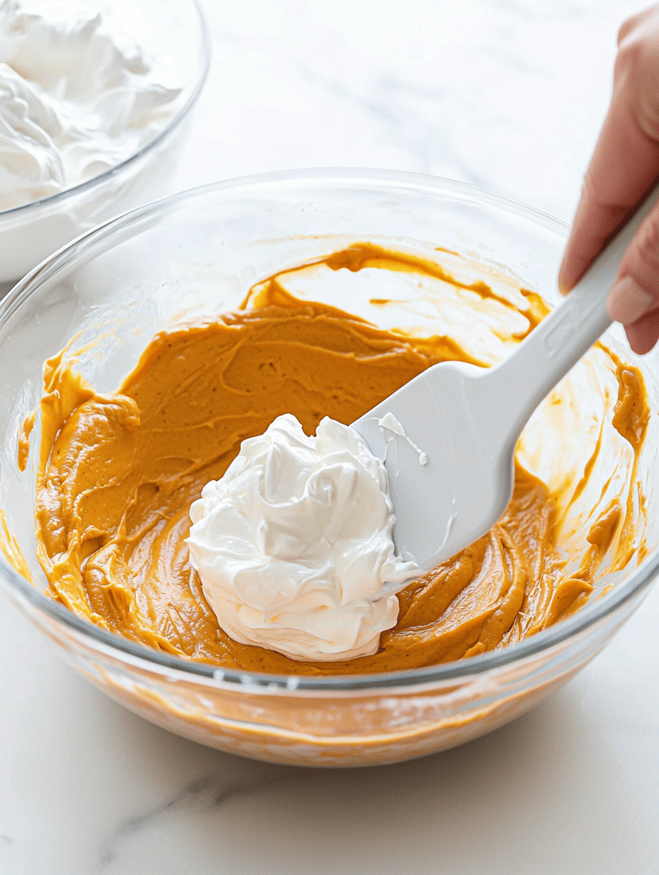 Gently fold the whipped cream into the pumpkin mixture using a rubber spatula, incorporating it gradually to keep the filling light and fluffy.