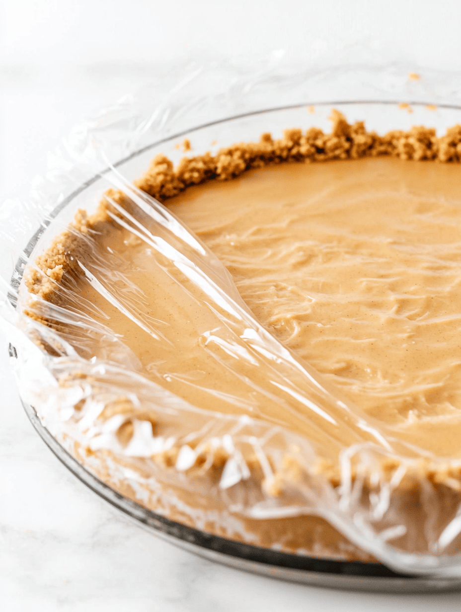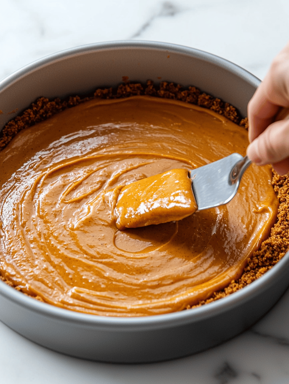 Pour the creamy pumpkin filling over the prepared crust, smoothing the top with a spatula for an even surface. Tap the pan gently on the counter to release any air bubbles.