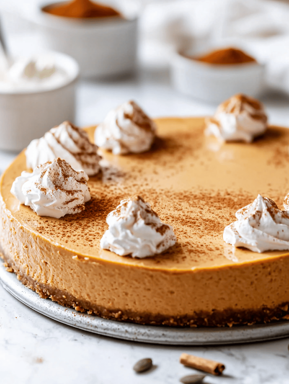 Once chilled and firm, release the sides of the springform pan and transfer the cheesecake to a serving platter. Decorate as desired with whipped cream, cinnamon dusting, or pumpkin seeds.