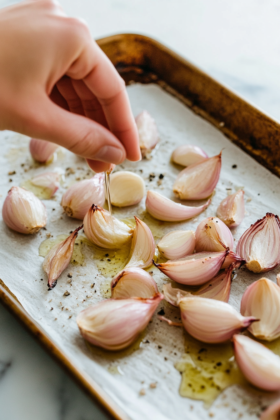 Toss the shallots on the baking sheet with 1 tablespoon of oil. Season with salt and pepper to taste.