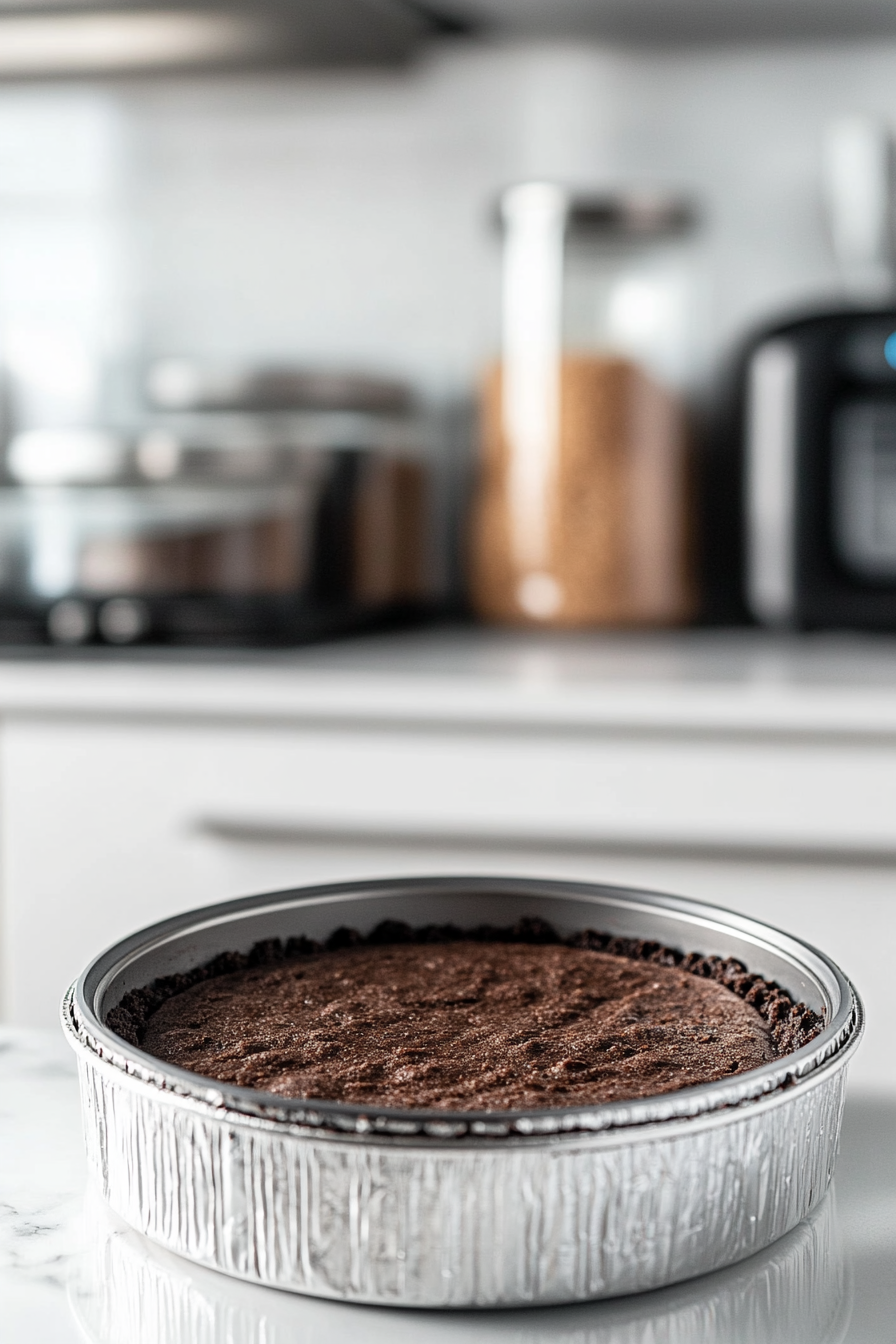 Crush Oreos into fine crumbs, mix with melted butter, and press into the pan's bottom and sides. Chill in the refrigerator.
