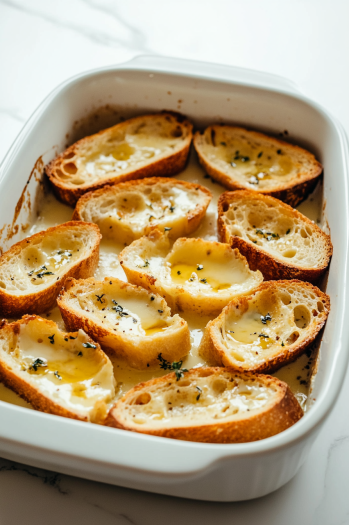 Arrange the bread slices in the casserole dish in a fan shape or any pattern you like. Pour the custard mixture evenly over the bread, pressing the slices gently. Sprinkle the cinnamon-sugar mixture over the top. Cover the dish with foil and refrigerate overnight or for at least 15 minutes.