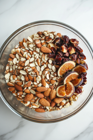 Mix Dry Ingredients: In a large bowl, combine the toasted almonds, hazelnuts, figs, and candied orange.