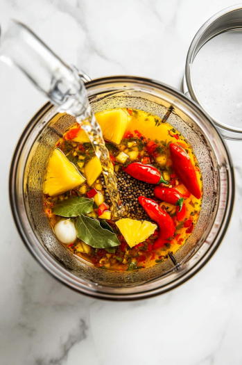 Blend the Sauce: After soaking, drain the chilies and put them in a blender. Add the garlic, oregano, cumin seeds, black peppercorns, bay leaf, and the pineapple juice. Pour in ½ cup of water and blend everything until you have a smooth sauce.