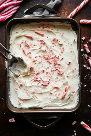 Gradually mix in the dry ingredients until just combined. Stir in chocolate chips and crushed candy canes.