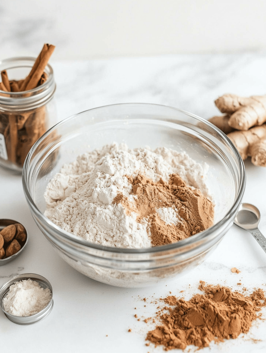 In a large mixing bowl, whisk together the gluten-free flour, baking powder, cinnamon, nutmeg, ginger, and salt until evenly combined.