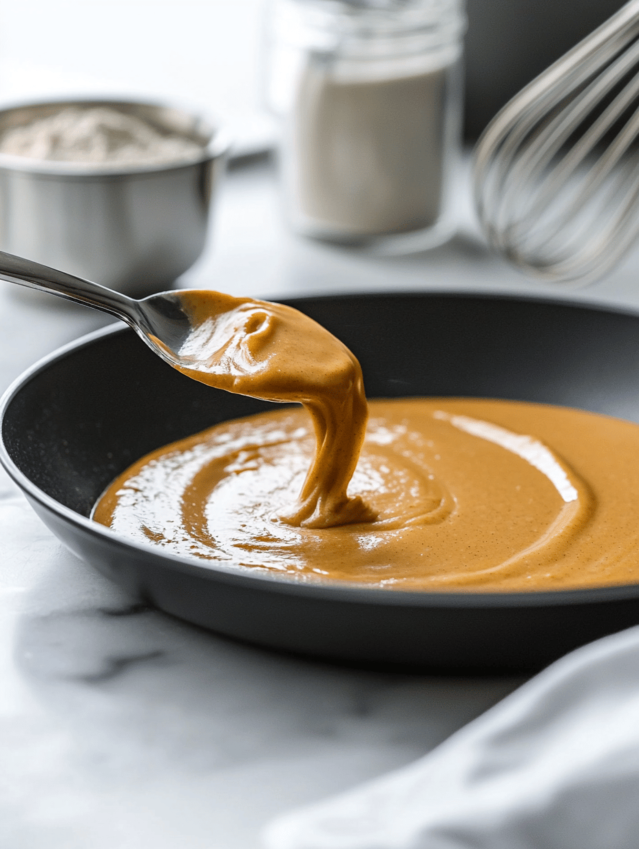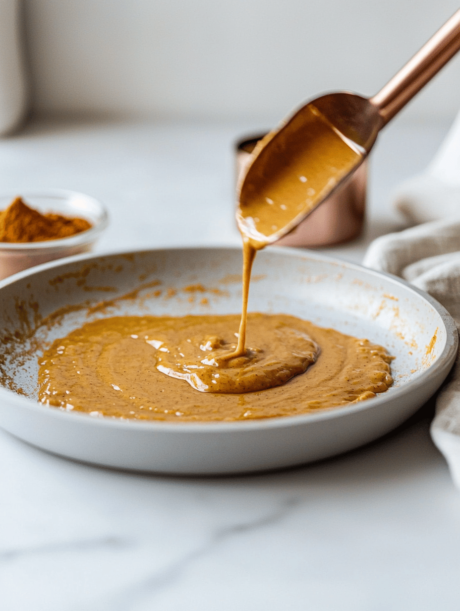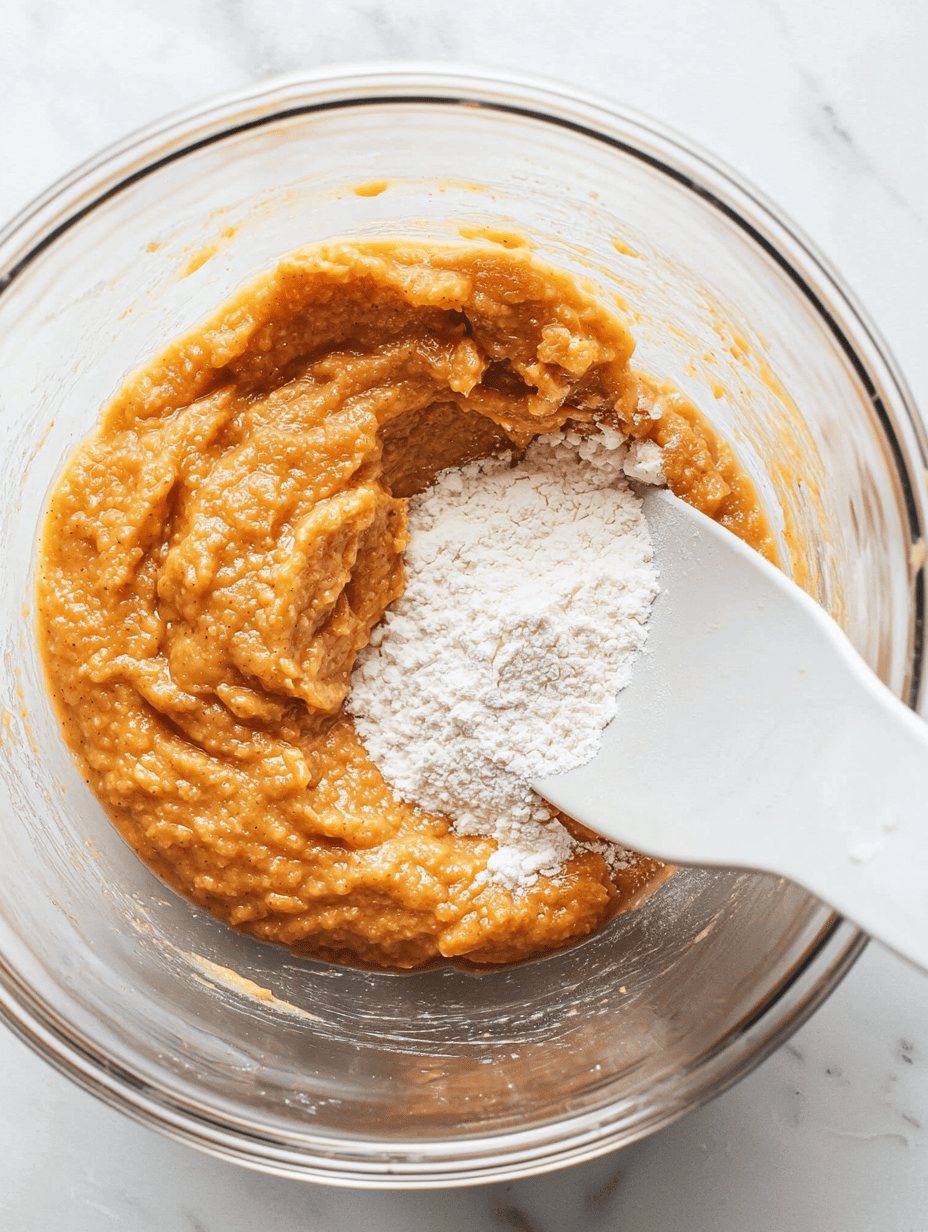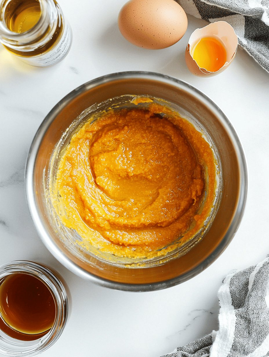 Add the pumpkin purée, milk, eggs, maple syrup, and olive oil to the dry ingredients. Whisk until the mixture is smooth and slightly thickened, with no lumps remaining.