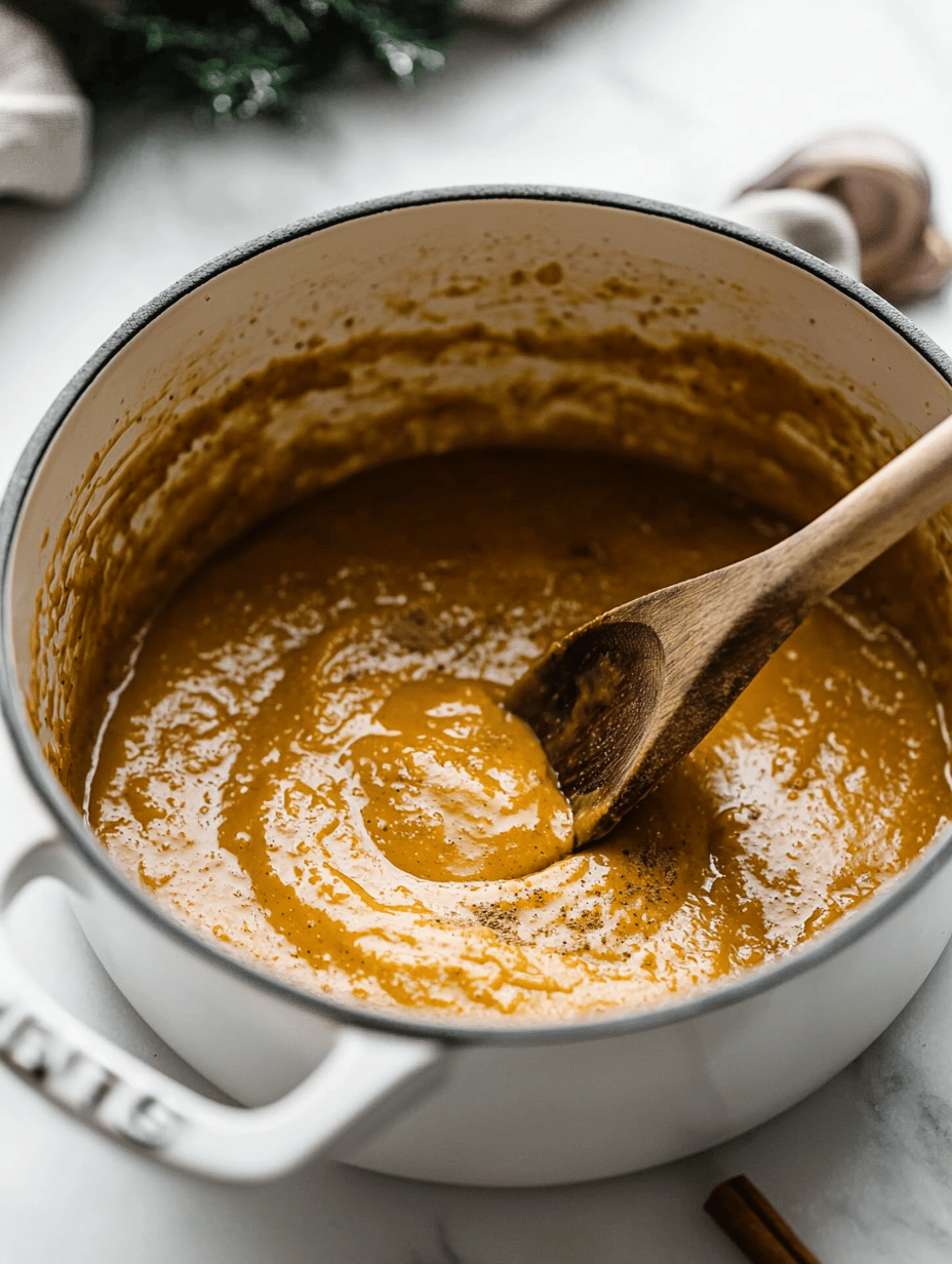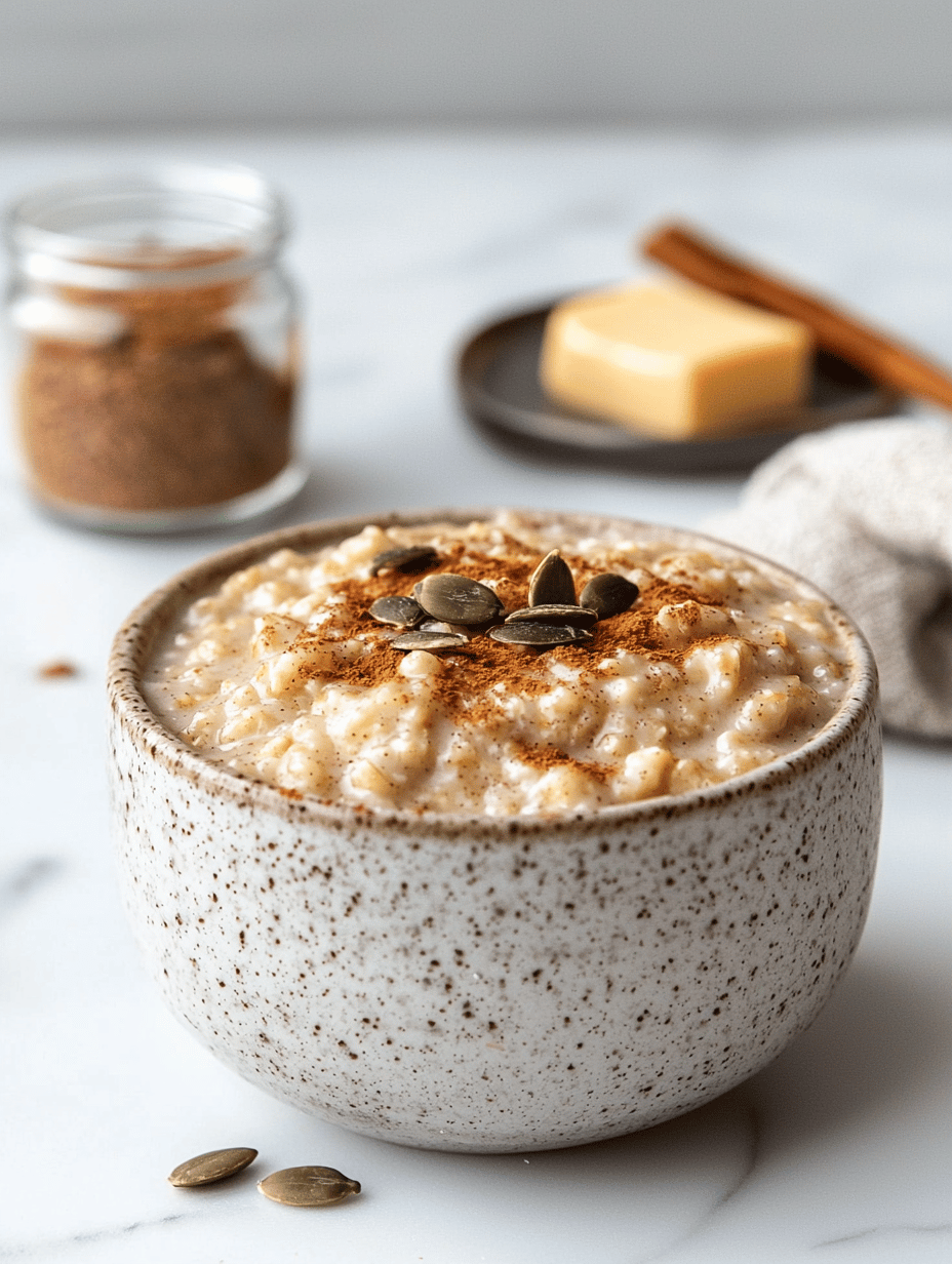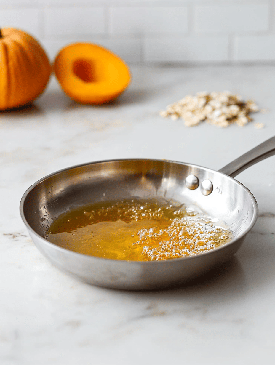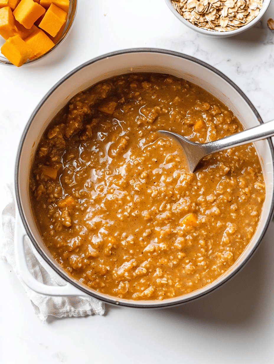 This pumpkin oatmeal combines hearty oats with smooth pumpkin puree and warm spices, cooked on the stove until creamy and thickened. A splash of brown butter is stirred in at the end, adding a nutty depth to the dish's velvety texture and inviting aroma. The final presentation yields a comforting, autumnal bowl with vibrant orange color and a smooth, thick consistency.