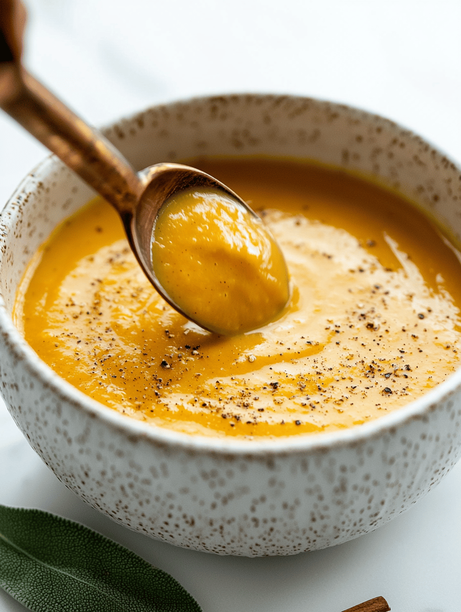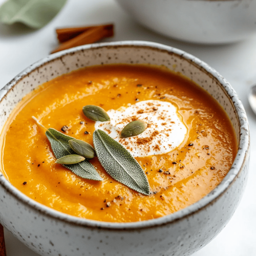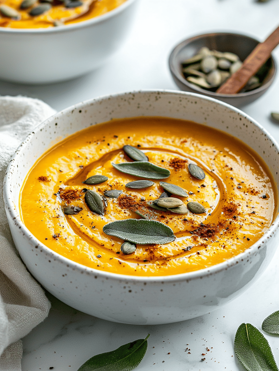 Pour the soup into bowls and garnish with toasted pumpkin seeds and crispy sage leaves for added texture and aroma. Serve hot, enjoying the creamy, fragrant dish with a sprinkle of extra cinnamon if desired.