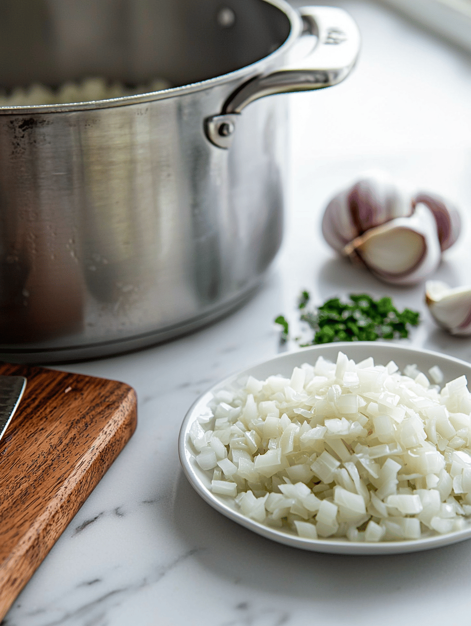 While the pumpkin roasts, dice the onion and mince the garlic. Heat the remaining tablespoon of olive oil in a large pot over medium heat. Add the onions and sauté for 5-7 minutes until they soften and become translucent, stirring occasionally.