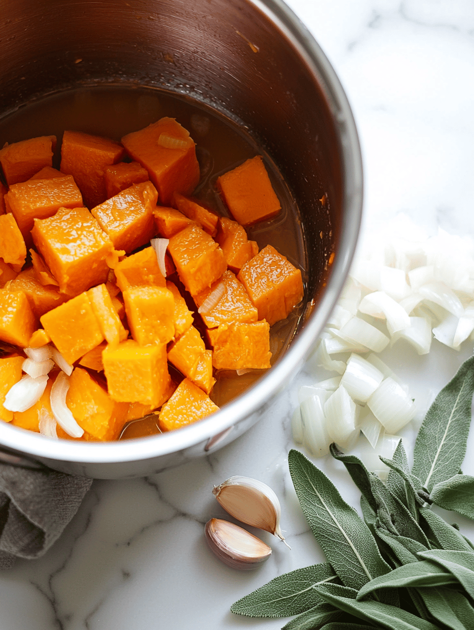 Once the pumpkin is roasted and cool enough to handle, add the pumpkin chunks to the pot. Pour in the vegetable broth and bring everything to a gentle boil. Reduce the heat and simmer for about 10 minutes to allow flavors to meld.