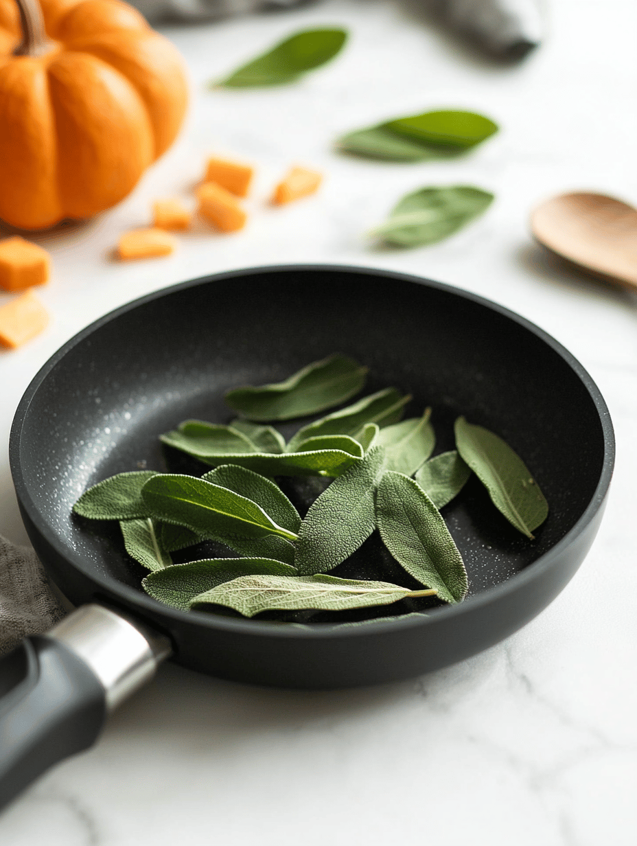 Meanwhile, fry the sage leaves in a small dry pan over medium heat for 1-2 minutes until fragrant and slightly crispy, then remove and set aside. This enhances their aroma without bitterness.