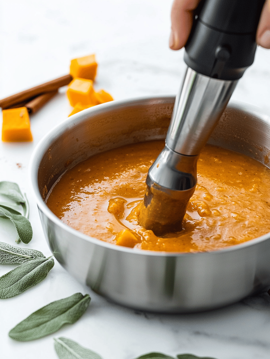 Use an immersion blender to purée the soup directly in the pot until smooth and velvety. Alternatively, transfer the soup in batches to a blender and blend until creamy. Return to the heat if needed.