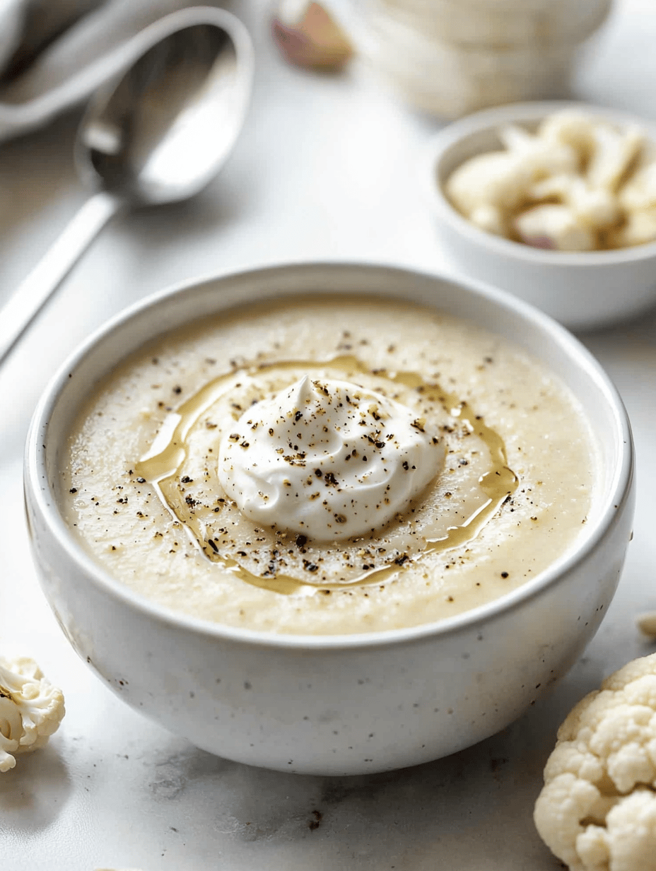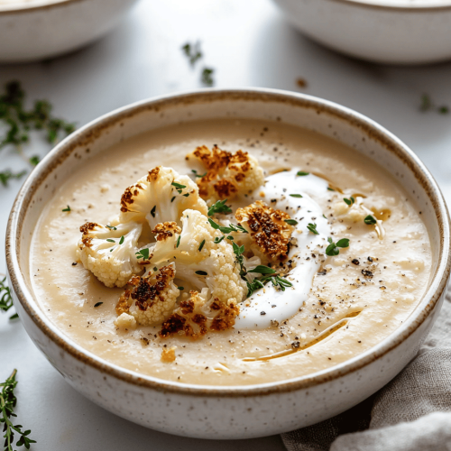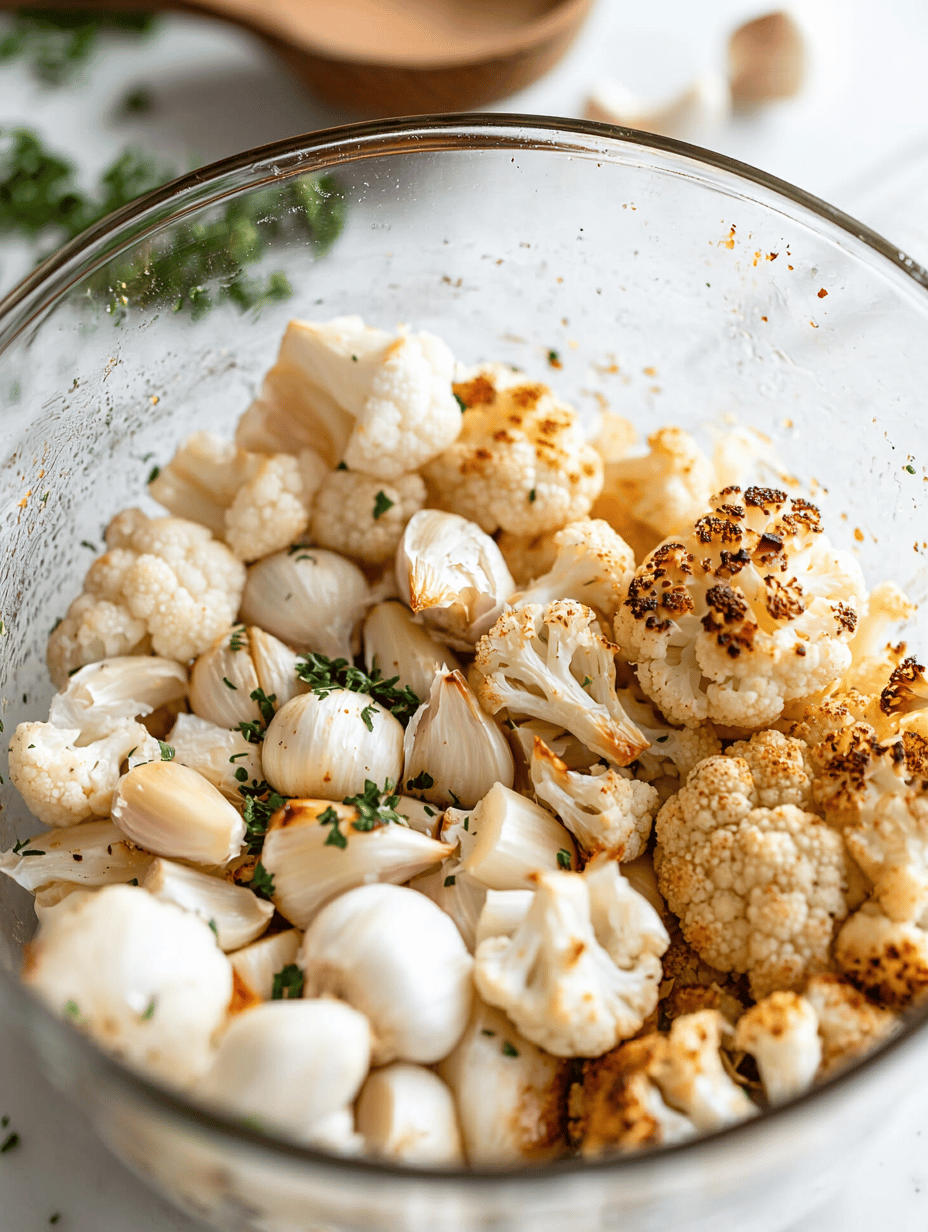 This soup features cauliflower and garlic that are roasted at high heat until caramelized, bringing out their natural sweetness and smoky flavor. The roasted vegetables are blended into a smooth, velvety texture with a rich, inviting aroma. It results in a warm, comforting bowl with a slightly chunky, rustic appearance and a deep golden hue.
